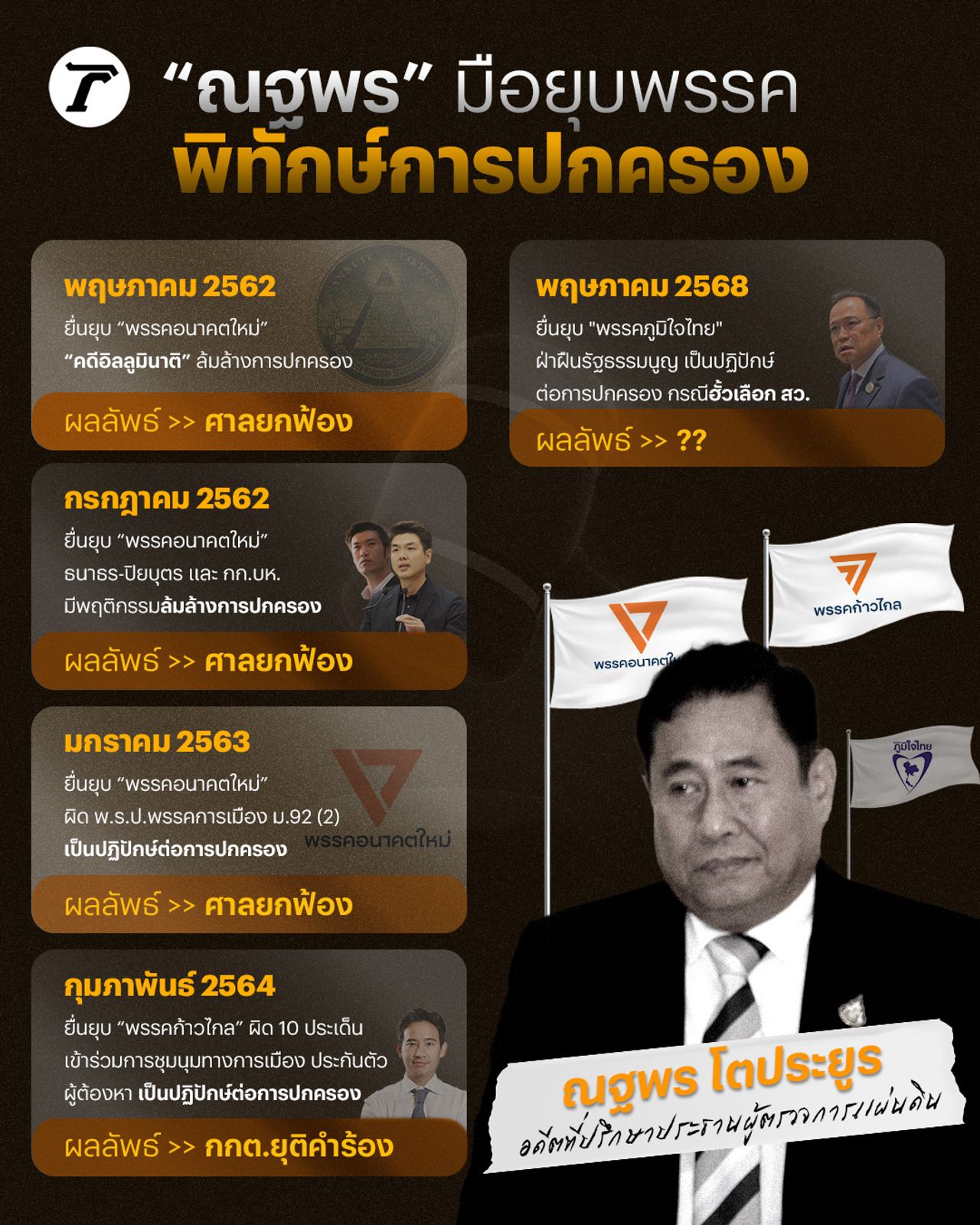 นายณฐพร โตประยูร อดีตที่ปรึกษาประธานผู้ตรวจการแผ่นดิน ที่ผ่านมาเขามักจะปรากฏในหน้าสื่อมวลชนโดยเฉพาะประเด็นการยื่นคำร้องให้ยุบพรรคการเมือง ล่าสุด กรณีของพรรคภูมิใจไทย ที่เพิ่งมายื่นคำร้องต่อคณะกรรมการการเลือกตั้ง (กกต.) ในวันที่ 21 พฤษภาคม 2568 โดยมองว่าทำผิดพ.ร.ป.พรรคการเมือง เข้าข่ายล้มล้างการปกครอง และเป็นปฏิปักษ์ต่อการปกครองระบอบประชาธิปไตยอันมีพระมหากษัตริย์ทรงเป็นประมุข จากกรณีที่พัวพันเรื่องคดีฮั้วเลือก สว.