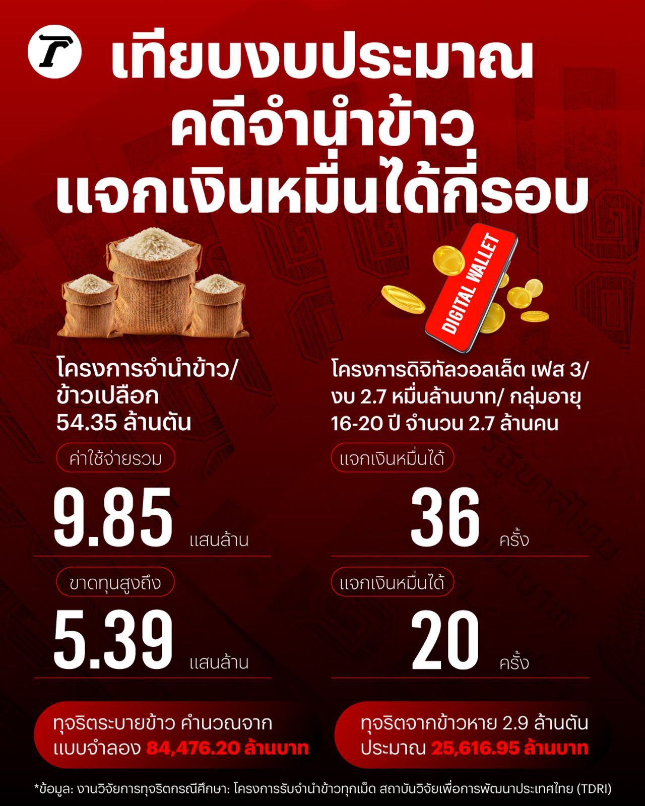 เทียบมูลค่าความเสียหายคดีจำนำข้าว จะสามารถดำเนินโครงการดิจิทัลวอลเล็ต เฟส 3 ได้ 36 ครั้ง โดยข้อมูลจากการวิจัย TDRI ประเมินการขาดทุนสูงสุดคดีจำนำข้าว 5.39 แสนล้าน โดยสามารถทำโครงการเงินหมื่นได้ 20 ครั้ง