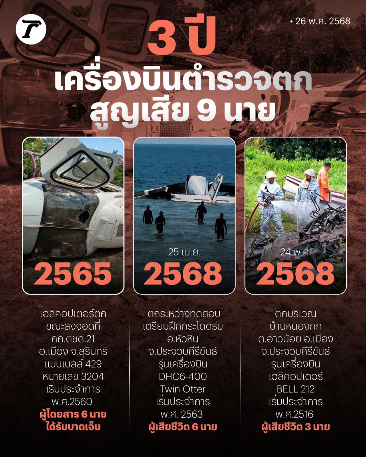 จากข้อมูลพบว่า 3 ปี เครื่องบินตำรวจตก สูญเสีย 9 นาย ดังนี้