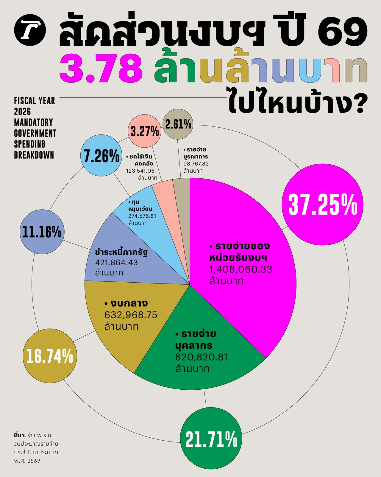 ร่างพระราชบัญญัติ (พ.ร.บ.) งบประมาณรายจ่ายประจำปีงบประมาณ พ.ศ. 2569 มูลค่ากว่า 3,780,600 ล้านล้านบาท มีภารกิจเพื่อขับเคลื่อนการพัฒนาประเทศให้สอดคล้องกับยุทธศาสตร์ชาติ โดยจำแนกเป็น 7 รายการตามกลุ่มงบประมาณ ได้แก่