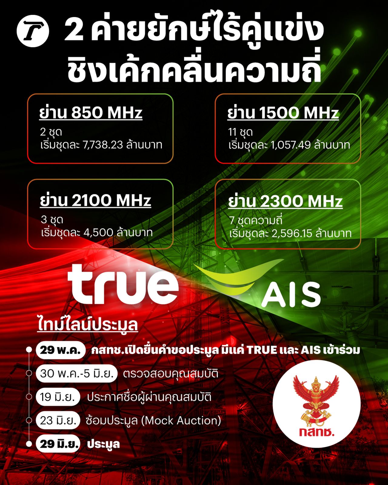 กสทช.ได้มีการเปิดยื่นคำขอประมูลเมื่อวันที่ 29 พ.ค. ที่ผ่านมา และปรากฏว่ามีเพียง 2 ค่ายยักษ์ใหญ่ คือ บริษัท ทรู มูฟ เอช ยูนิเวอร์แซล คอมมิวนิเคชั่น จำกัด หรือ TRUE และบริษัท แอดวานซ์ ไวร์เลส เน็ทเวอร์ค จำกัด หรือ AIS เข้าร่วมเท่านั้น