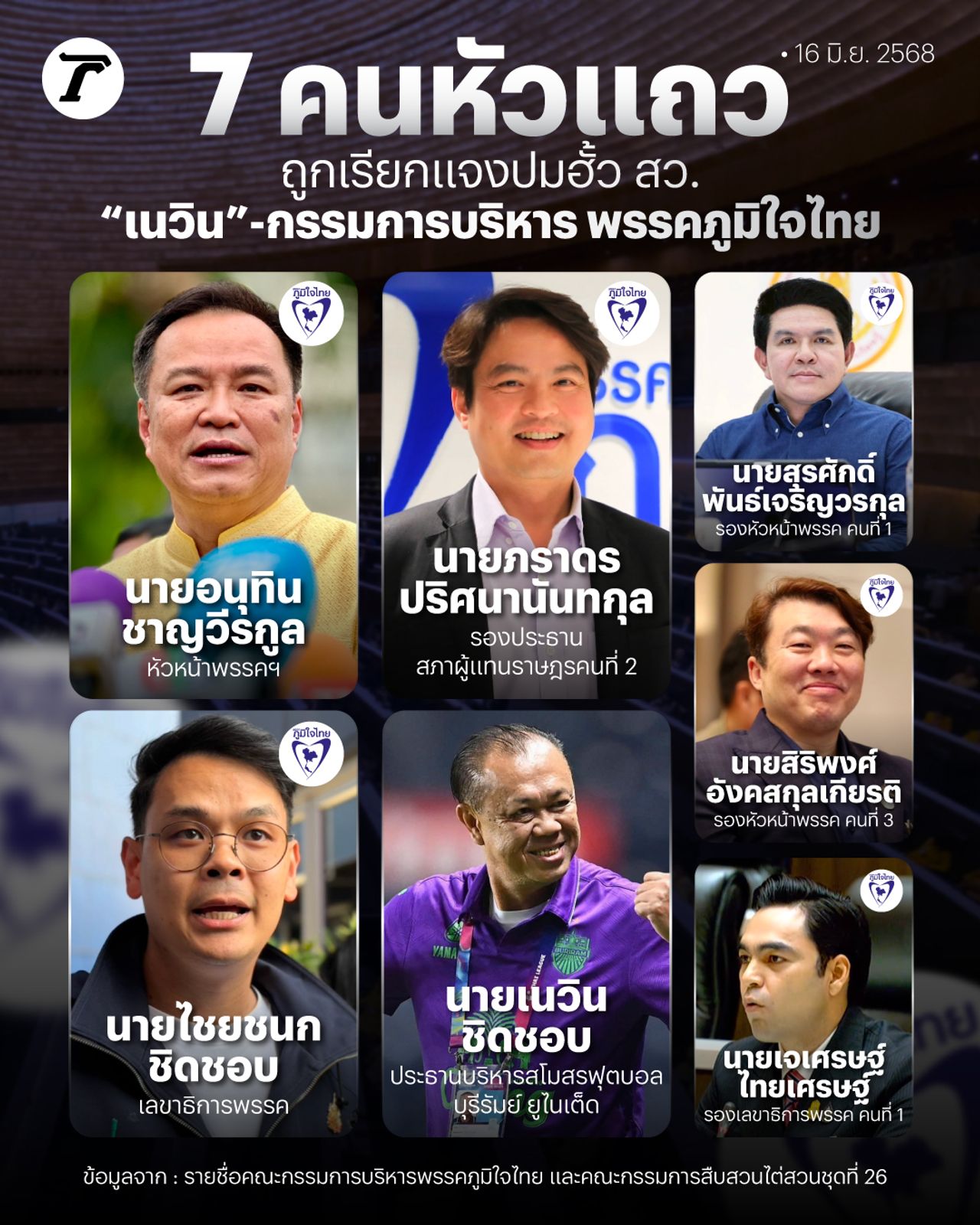 “เนวิน” + กรรมการบริหาร พรรคภูมิใจไทย “7 คนหัวแถว” ถูกเรียกแจงปมฮั้ว สว. รวมทั้งหมด 17 คน “โฆษกพรรค” สวนกลับเตรียมฟ้อง “คณะกรรมการสืบสวนไต่สวน ชุด 26” ของ กกต. ฐานแจ้งความเท็จ กล่าวหาเอี่ยวฮั้วเลือก สว.