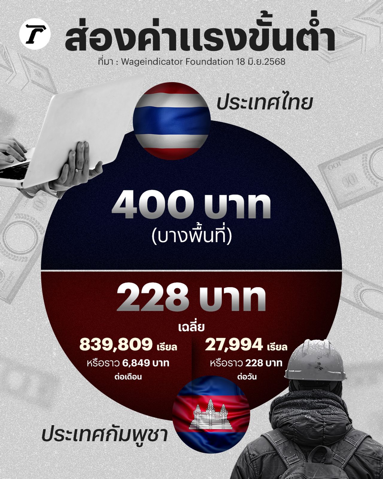 ตัดภาพไปที่ค่าแรงขั้นต่ำของกัมพูชา ตามการรายงานของ Wageindicator Foundation ระบุว่า อยู่ที่ 839,809 เรียลต่อเดือน หรือราว 6,849 บาทต่อเดือน หากเฉลี่ยเป็นวันจะตกวันละ 228 บาทต่อวัน เป็นหนึ่งในสาเหตุที่แรงงานกัมพูชาจำนวนไม่น้อย ไม่ต้องการกลับไปทำงานที่ประเทศบ้านเกิด