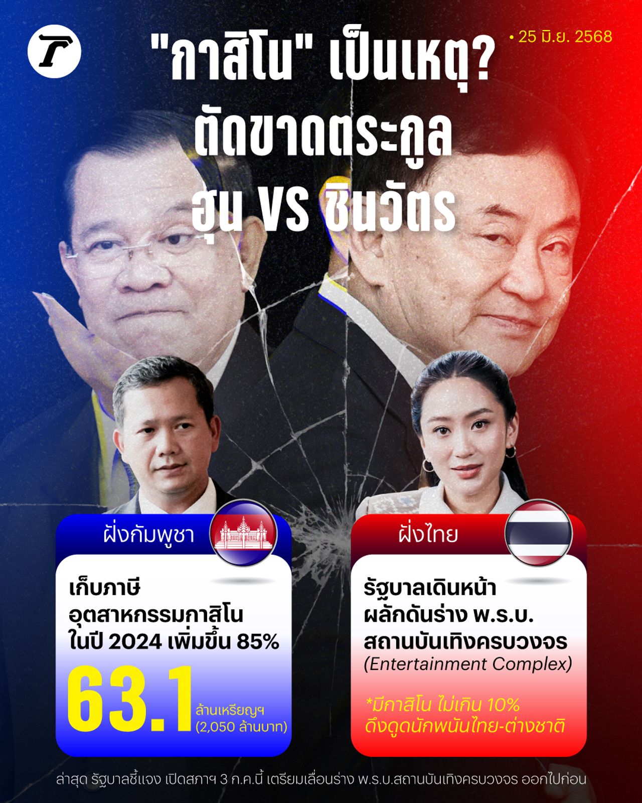 เรื่องนี้จะเป็นสาเหตุที่แท้จริงหรือไม่นั้น ทาง “ฮุน เซน” ก็ยังไม่ได้พูดออกมาจากปากตัวเอง และคงไม่ยอมพูดอย่างแน่นอน เพราะคงจะเป็นภาพลบกับตัวเขาเอง ที่ตอนนี้ได้กระแสสนับสนุนจากประชาชนในประเทศตัวเองไปไม่น้อย กับการทำให้การเมืองไทยระส่ำจากคลิปเสียงของตนเอง แต่ก็คงไม่สามารถทิ้งประเด็นนี้ไปได้ ว่า “กาสิโน” นี่คือสาเหตุที่แท้จริงขอรอยแตกร้าวระหว่างตระกูล “ฮุน” และตระกูล “ชินวัตร”