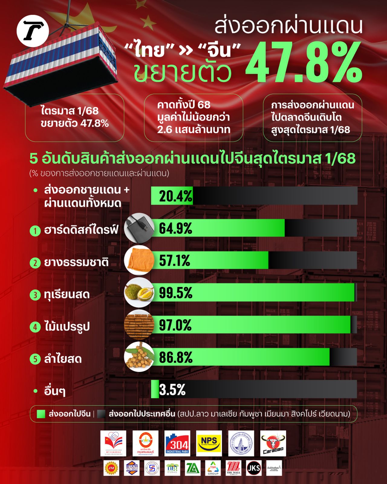 การส่งออกไทยไปจีนขยายตัว 47.8% ในไตรมาสแรกของปี 68 สะท้อนภาพคู่ค้าสำคัญ คาดว่าทั้งปีจะมีมูลค่าไม่น้อยกว่า 2.6 แสนล้านบาท โดยสินค้าส่งออกมากที่สุดคือ ฮาร์ดดิสก์ไดรฟ์ ยางธรรมชาติ และทุเรียนสด