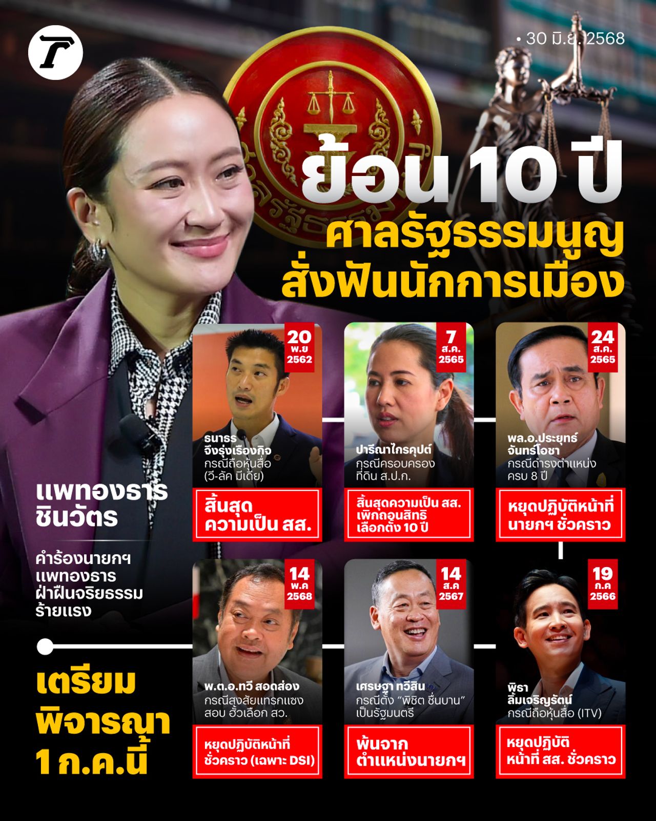 ในวันที่ 1 กรกฎาคม 2568 นี้ องค์คณะตุลาการศาลรัฐธรรมนูญ ได้นัดประชุมปรึกษาคดีประจำสัปดาห์ หนึ่งในคดีที่ได้รับความสนใจจากสังคม คือกรณีที่นายมงคล สุระสัจจะ ประธานวุฒิสภา ยื่นคำร้องของสมาชิกวุฒิสภา 36 คน ขอให้ศาลรัฐธรรมนูญวินิจฉัยความเป็นนายกรัฐมนตรีของ น.ส.แพทองธาร ชินวัตร นายกรัฐมนตรี สิ้นสุดลงหรือไม่ จากกรณี "คลิปหลุด" พูดคุยทางโทรศัพท์กับสมเด็จฮุน เซน ผู้นำกัมพูชา จนอาจทำให้ต้องยุติการปฏิบัติหน้าที่นายกฯ