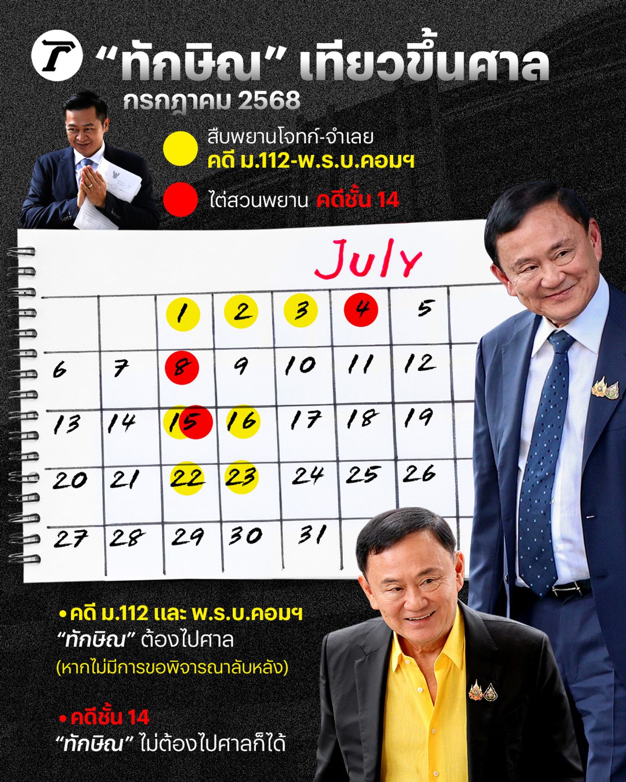 ทั้งนี้ในเดือนกรกฎาคม นายทักษิณ มีกำหนดขึ้นศาลหลายครั้งใน 2 คดี ศาลอาญานัดสืบพยาน ในความผิด ม.112 และ พ.ร.บ.คอมฯ และศาลฎีกาแผนกคดีอาญาของผู้ดำรงตำแหน่งทางการเมือง นัดไต่สวนพยาน กรณีการบังคับโทษจำคุกในช่วงที่นายทักษิณเข้ารับการรักษาตัวที่ชั้น 14 ของ รพ.ตำรวจ โดยมีกำหนดการนัดหมายดังนี้