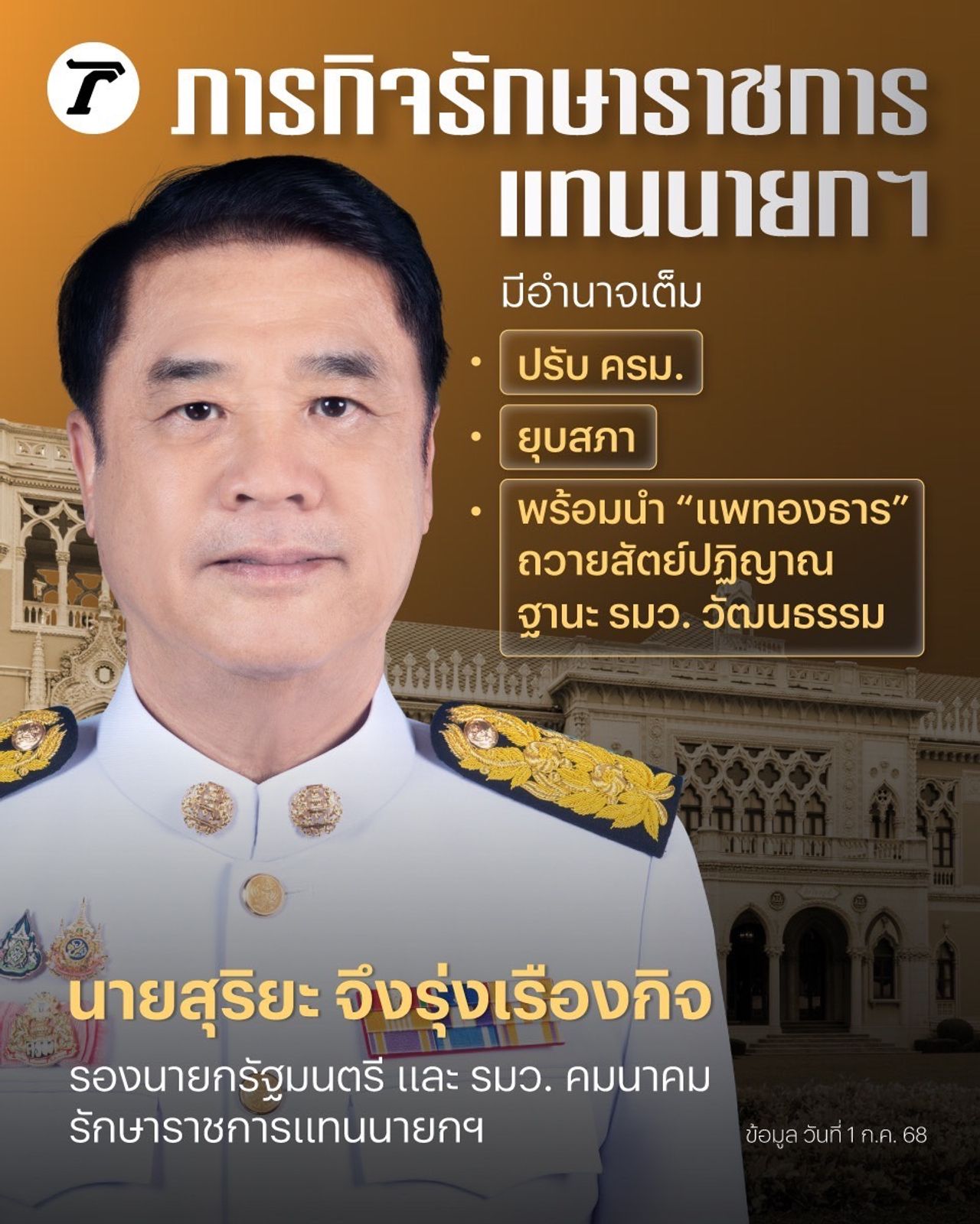 "สุริยะ จึงรุ่งเรืองกิจ" ภารกิจรักษาราชการแทนนายกฯ มีอำนาจเต็มปรับ ครม.-ยุบสภา พร้อมนำ "แพทองธาร" ถวายสัตย์ปฏิญาณในฐานะ รมว. วัฒนธรรม เดินหน้าฝ่าวิกฤตรอบทิศ