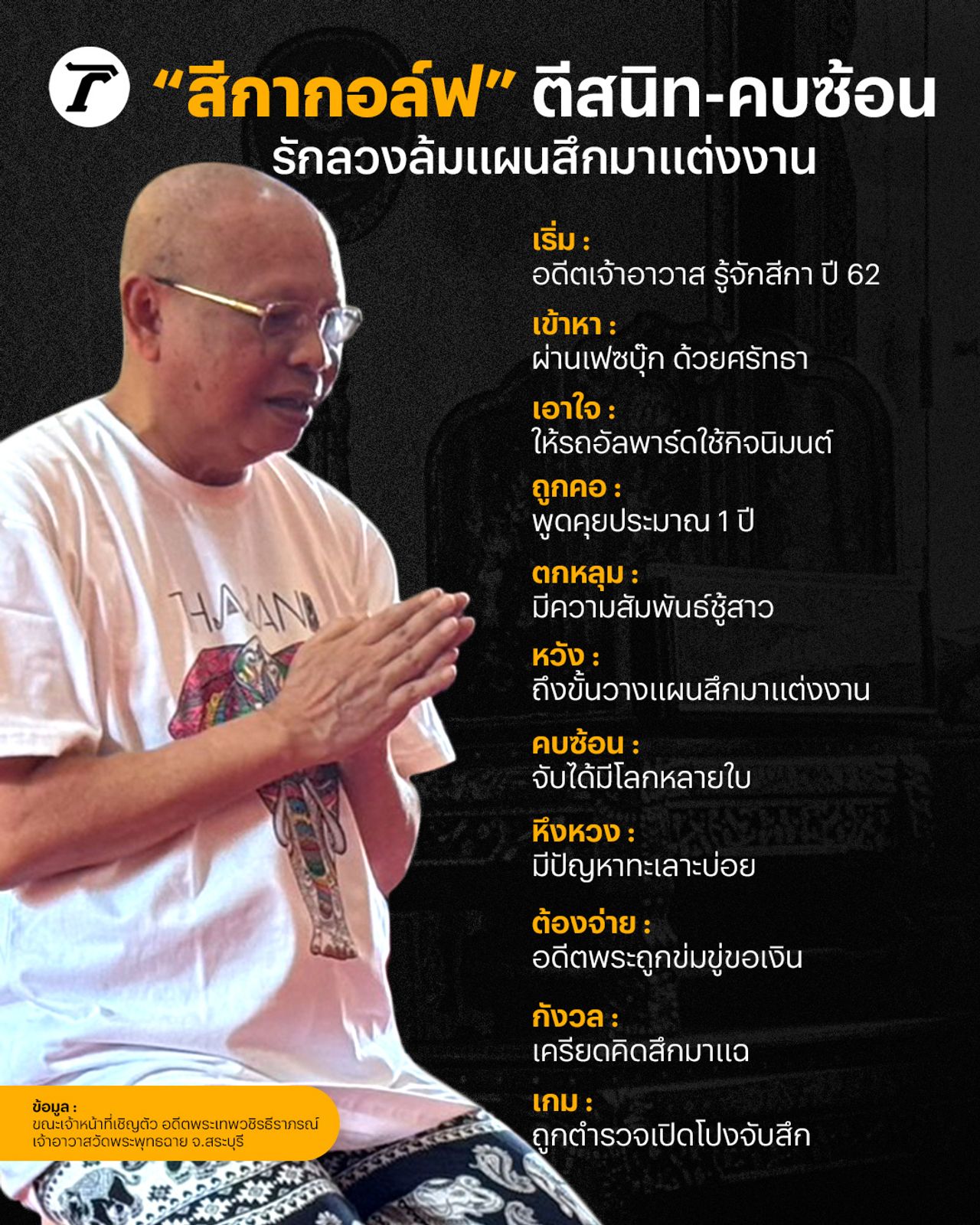 11 ความสัมพันธ์ถลำลึก “สีกากอล์ฟ” ตีสนิท-คบซ้อน ถึงขั้นล้มแผนสึกมาแต่งงาน จากคำให้การอดีตเจ้าอาวาส จาก 6 ปีก่อนทักผ่านเฟซบุ๊ก ให้รถอัลพาร์ดใช้ทำกิจนิมนต์ ก่อนมีสัมพันธ์ชู้สาว สุดท้ายถูกเปิดโปงจนต้องสึกขาดจากความเป็นพระ