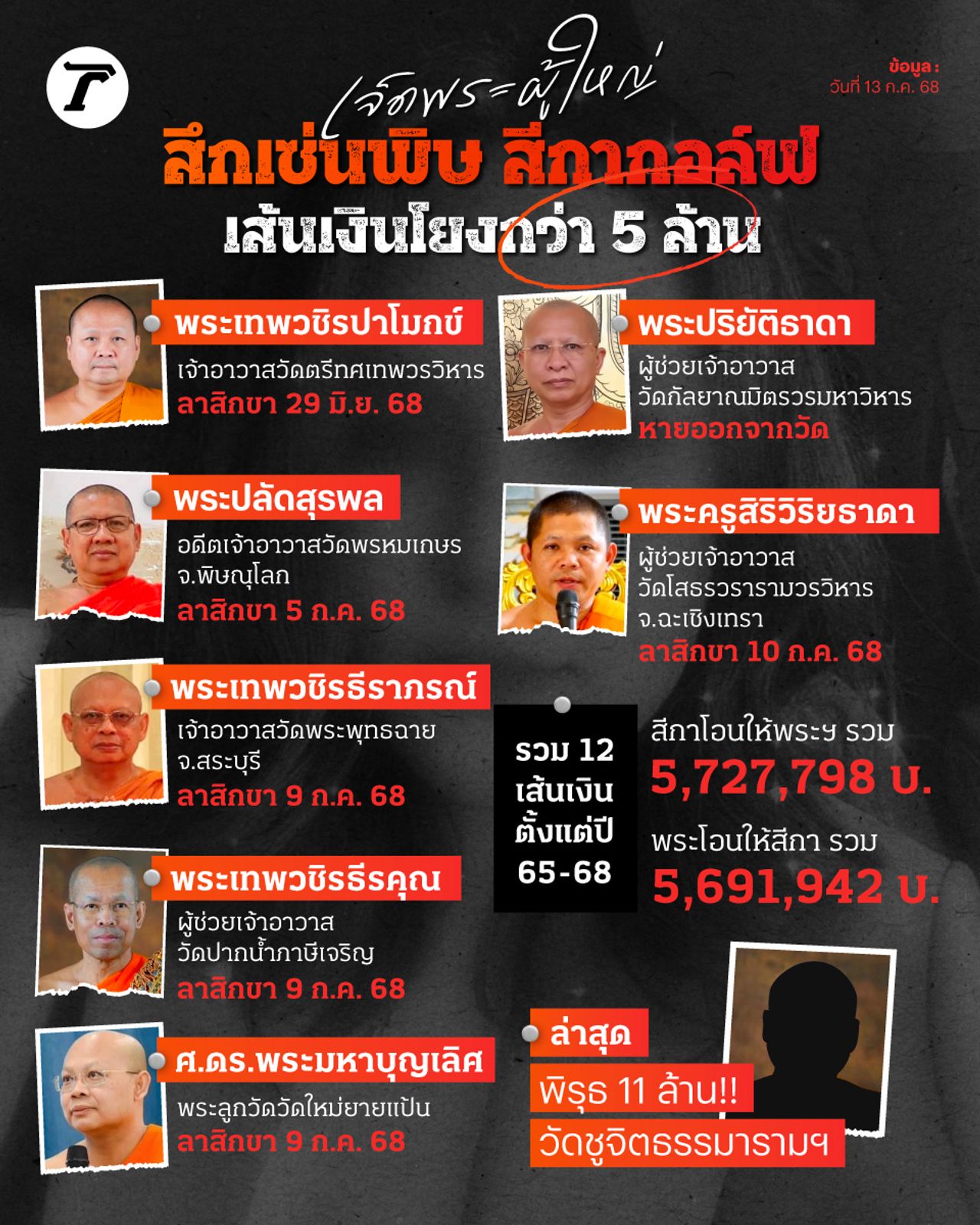 7 พระผู้ใหญ่ สึกเซ่นพิษ สีกากอล์ฟ สัปดาห์ที่ผ่านมาสึกติดต่อกัน 5 รูป สำรวจเส้นเงินโยงกว่า 5 ล้าน อดีตเจ้าอาวาสวัดพระพุทธฉาย จ.สระบุรี รับเงินโอนกว่า 3 ล้านบาท พบพิรุธ 4 ปี เงินหมุนเวียนในจักรวาลสีกามหาศาล ล่าสุดพบพิรุธ 11 ล้าน วัดชูจิตธรรมารามฯ
