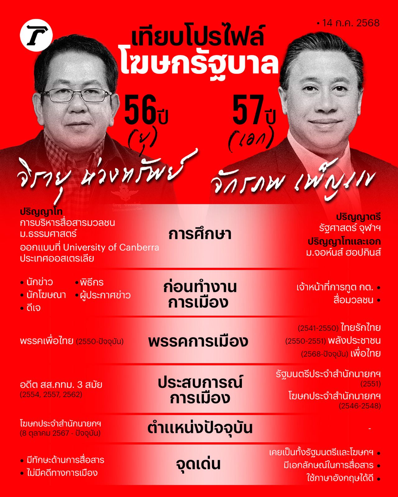 “โฆษกรัฐบาล” หรือ โฆษกประจำสำนักนายกรัฐมนตรี ในรัฐบาลของ น.ส.แพทองธาร ชินวัตร เป็นอีกหนึ่งตำแหน่งที่กำลังจะมีการปรับเปลี่ยนโยกย้าย โดยเฉพาะในห้วงเวลาที่ “การสื่อสารทางการเมือง” เป็นสิ่งสำคัญที่จะเป็นเครื่องมือให้รัฐบาลที่เผชิญกับกระแสนิยมที่หันหัวลง ปัจจุบันผู้ที่ดำรงตำแหน่งนี้คือ นายจิรายุ ห่วงทรัพย์ อดีต สส.กทม. 3 สมัย แต่มีความเคลื่อนไหวอย่างเปิดเผยจาก นายจักรภพ เพ็ญแข อดีต รมต.สำนักนายกฯ และโฆษกรัฐบาลยุคไทยรักไทยและพลังประชาชน ว่าตัวเองกำลังเป็น “ว่าที่” ในตำแหน่งนี้