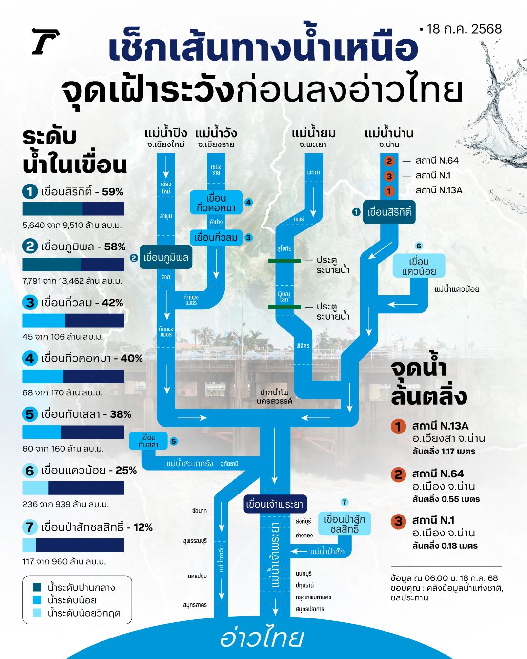 ด้านสถานการณ์น้ำล่าสุด กรมชลประทาน เปิดเผยข้อมูล ณ เวลา 06.00 น. ว่ามีจุดน้ำล้นตลิ่ง 5 แห่ง อยู่ในภาคเหนือ 4 แห่ง และภาคอีสาน 1 แห่ง คือ