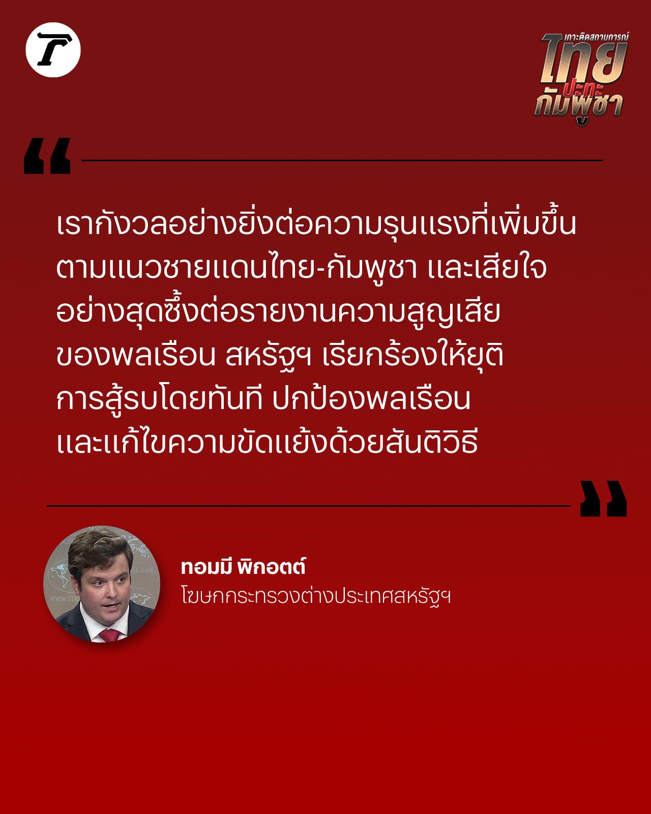 “เรากังวลอย่างยิ่งต่อความรุนแรงที่เพิ่มขึ้นตามแนวชายแดนไทย-กัมพูชา และเสียใจอย่างสุดซึ้งต่อรายงานความสูญเสียของพลเรือน สหรัฐฯ เรียกร้องให้ยุติการสู้รบโดยทันที ปกป้องพลเรือน และแก้ไขความขัดแย้งด้วยสันติวิธี”