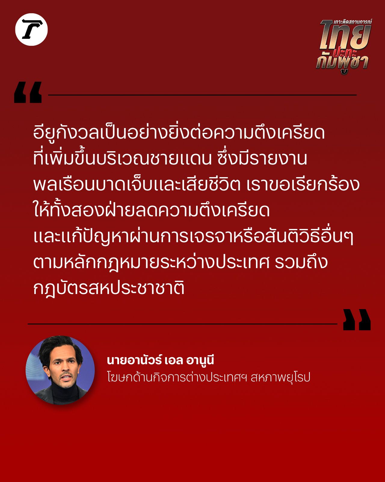 “อียูกังวลเป็นอย่างยิ่งต่อความตึงเครียดที่เพิ่มขึ้นบริเวณชายแดน ซึ่งมีรายงานพลเรือนบาดเจ็บและเสียชีวิต เราขอเรียกร้องให้ทั้งสองฝ่ายลดความตึงเครียดและแก้ปัญหาผ่านการเจรจาหรือสันติวิธีอื่นๆ ตามหลักกฎหมายระหว่างประเทศ ซึ่งรวมถึงกฎบัตรสหประชาชาติ"