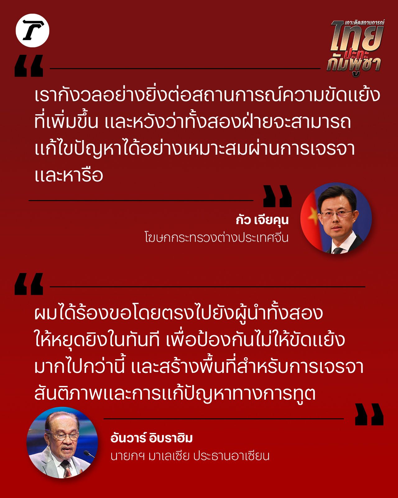 ขณะที่นาย กัว เจียคุน โฆษกกระทรวงการต่างประเทศจีน เปิดเผยระหว่างการแถลงข่าวประจำวันที่กรุงปักกิ่ง ในวันที่ 24 ก.ค. ว่า จีนกังวลต่อสถานการณ์ที่เกิดขึ้น และมีจุดยืนที่ยุติธรรม เป็นกลาง ส่งเสริมการแก้ไขปัญหาด้วยสันติภาพและการเจรจา คำนึงถึงผลประโยชน์ร่วมกัน
