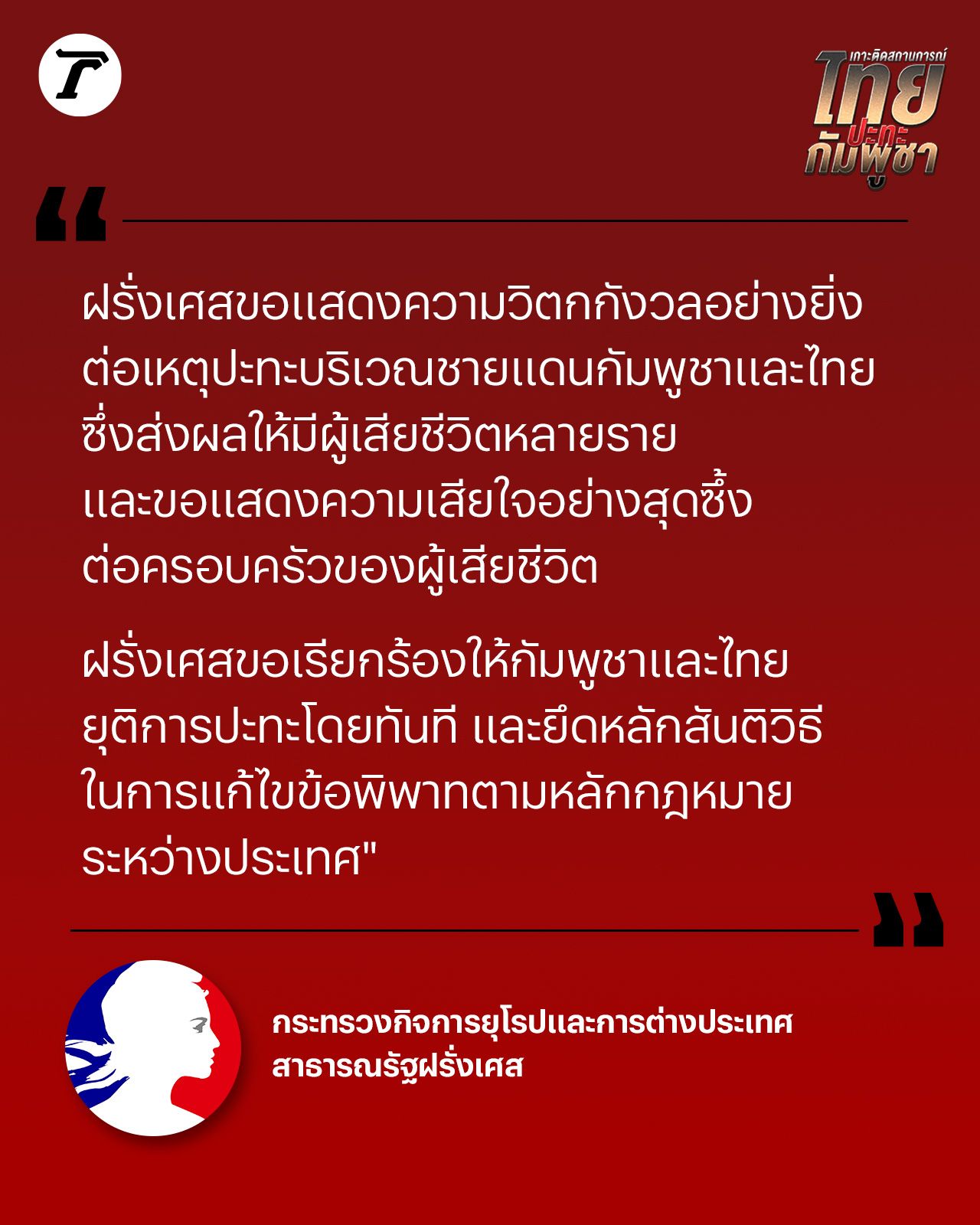 "ฝรั่งเศสขอแสดงความวิตกกังวลอย่างยิ่งต่อเหตุปะทะบริเวณชายแดนระหว่างกัมพูชาและไทยเมื่อวันที่ 24 กรกฎาคม 2568 ซึ่งส่งผลให้มีผู้เสียชีวิตหลายราย และขอแสดงความเสียใจอย่างสุดซึ้งต่อครอบครัวของผู้เสียชีวิ9 ฝรั่งเศสขอเรียกร้องให้กัมพูชาและไทยยุติการปะทะโดยทันที และยึดหลักสันติวิธีในการแก้ไขข้อพิพาทตามหลักกฎหมายระหว่างประเทศ"