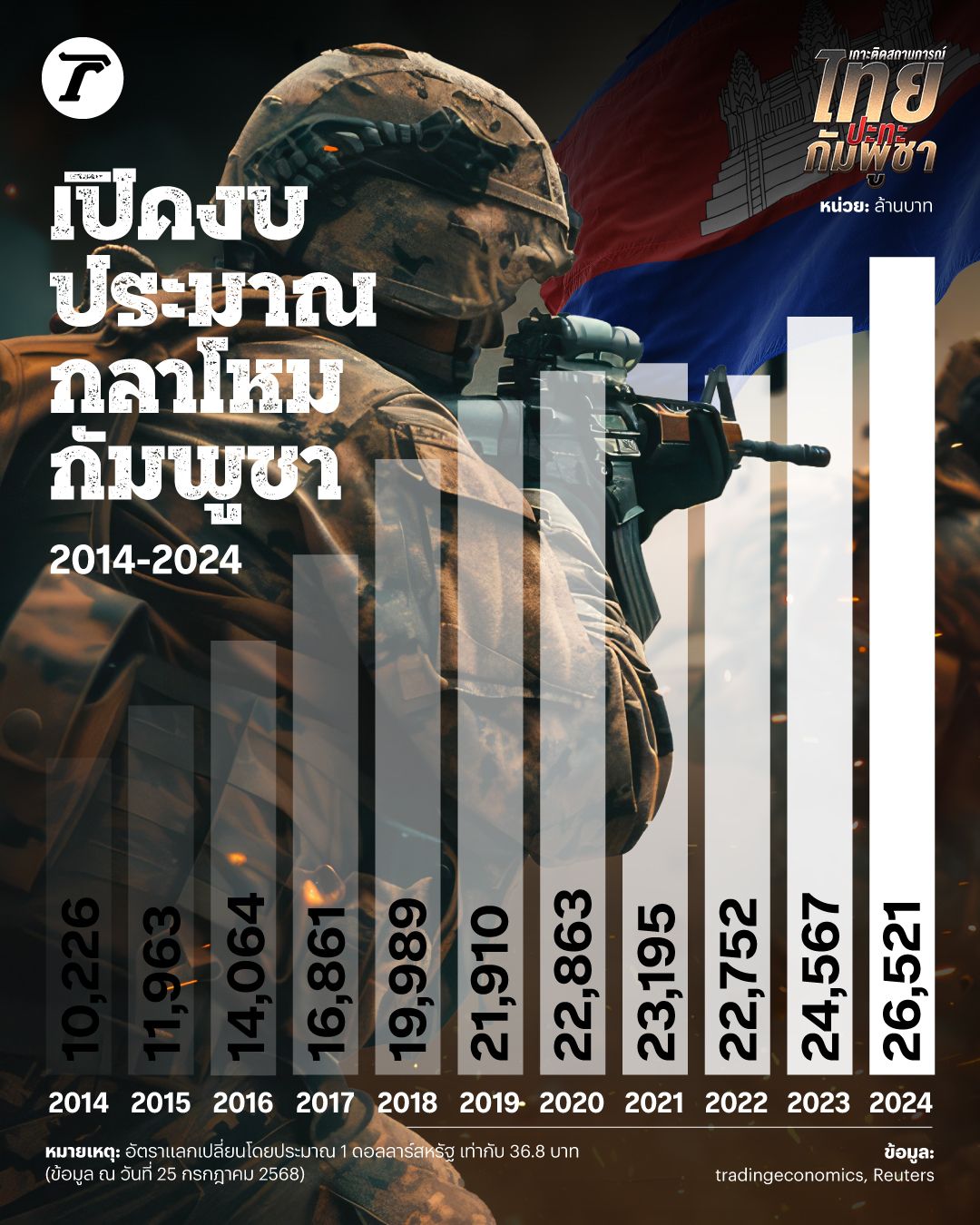 เมื่อพิจารณาข้อมูลตั้งแต่ปี 2014 ที่มีงบประมาณ 277.9 ล้านดอลลาร์สหรัฐ มาจนถึงปี 2024 ที่งบประมาณพุ่งสูงถึง 720.5 ล้านดอลลาร์สหรัฐ พบว่า งบประมาณด้านการทหารของกัมพูชาเพิ่มขึ้นถึงประมาณ 159.26% ในระยะเวลา 10 ปี