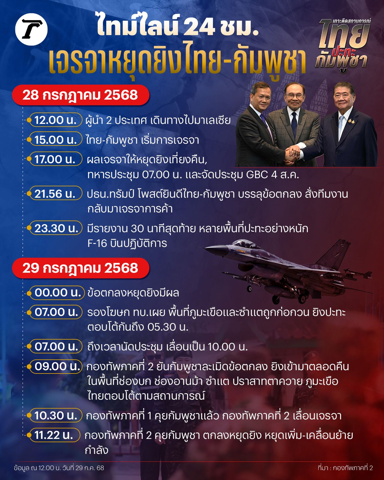 สรุปไทม์ไลน์ 24 ชั่วโมง การเจรจาหยุดยิงระหว่างไทยและกัมพูชา ตั้งแต่ผู้นำทั้ง 2 ประเทศเดินทางไปเจรจากันที่มาเลเซียวานนี้ (28 ก.ค.) และได้ข้อตกลงหยุดยิงทันทีเวลาเที่ยงคืน แต่ปรากฏว่ากัมพูชาละเมิด ยังคงก่อกวนยิงเข้ามาในพื้นที่ของไทยตลอดทั้งคืน จนในการพูดคุยของทหาร 2 ฝ่ายในวันนี้ (29 ก.ค.) ได้ข้อตกลงอีกครั้ง สั่งหยุดยิง ห้ามเพิ่มกำลังพลหรือเคลื่อนย้ายกำลังพลเข้าพื้นที่ รอหารือ GBC อีกครั้งในวันที่ 4 ส.ค.