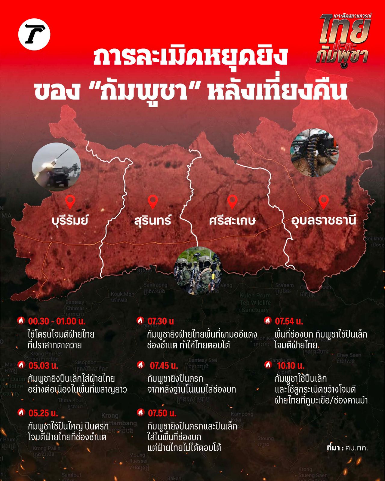 - เวลา 07.50 น. กัมพูชายิงปืนครก (ค.) และปืนเล็กใส่ฝ่ายเรา แต่ฝ่ายเราไม่ได้ตอบโต้แต่อย่างใด