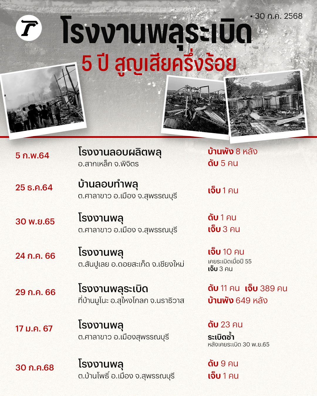 - วันที่ 30 ก.ค.68 : โรงงานพลุระเบิด ต.บ้านโพธิ์ อ.เมือง จ.สุพรรณบุรี ดับ 9 เจ็บ 1 คน