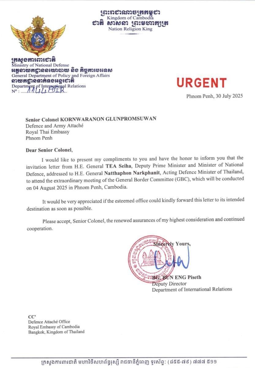 วันนี้ (31 ก.ค. 68) กระทรวงกลาโหมกัมพูชา โพสต์ภาพจดหมายลงวันที่ 30 ก.ค. 2568 ระบุว่า พลเอกเตีย เซ็ยฮา รองนายกฯ และ รมว.กลาโหมกัมพูชา เรียนเชิญ พลเอก ณัฐพล นาคพาณิชย์ รักษาการรัฐมนตรีว่าการกระทรวงกลาโหม เข้าร่วมประชุมคณะกรรมการชายแดนทั่วไป (GBC) ในวันที่ 4 ส.ค. 2568 ที่กรุงพนมเปญ ประเทศกัมพูชา