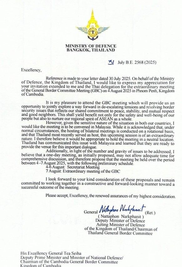"พล.อ.ณัฐพล" รักษาการ รมว.กลาโหม ตอบรับคำเชิญ กัมพูชา ร่วมประชุม GBC 4 ส.ค.นี้ แต่เสนอเปลี่ยนสถานที่เป็นมาเลเซีย และขยายเวลาประชุมเป็น 4-7 ส.ค.
