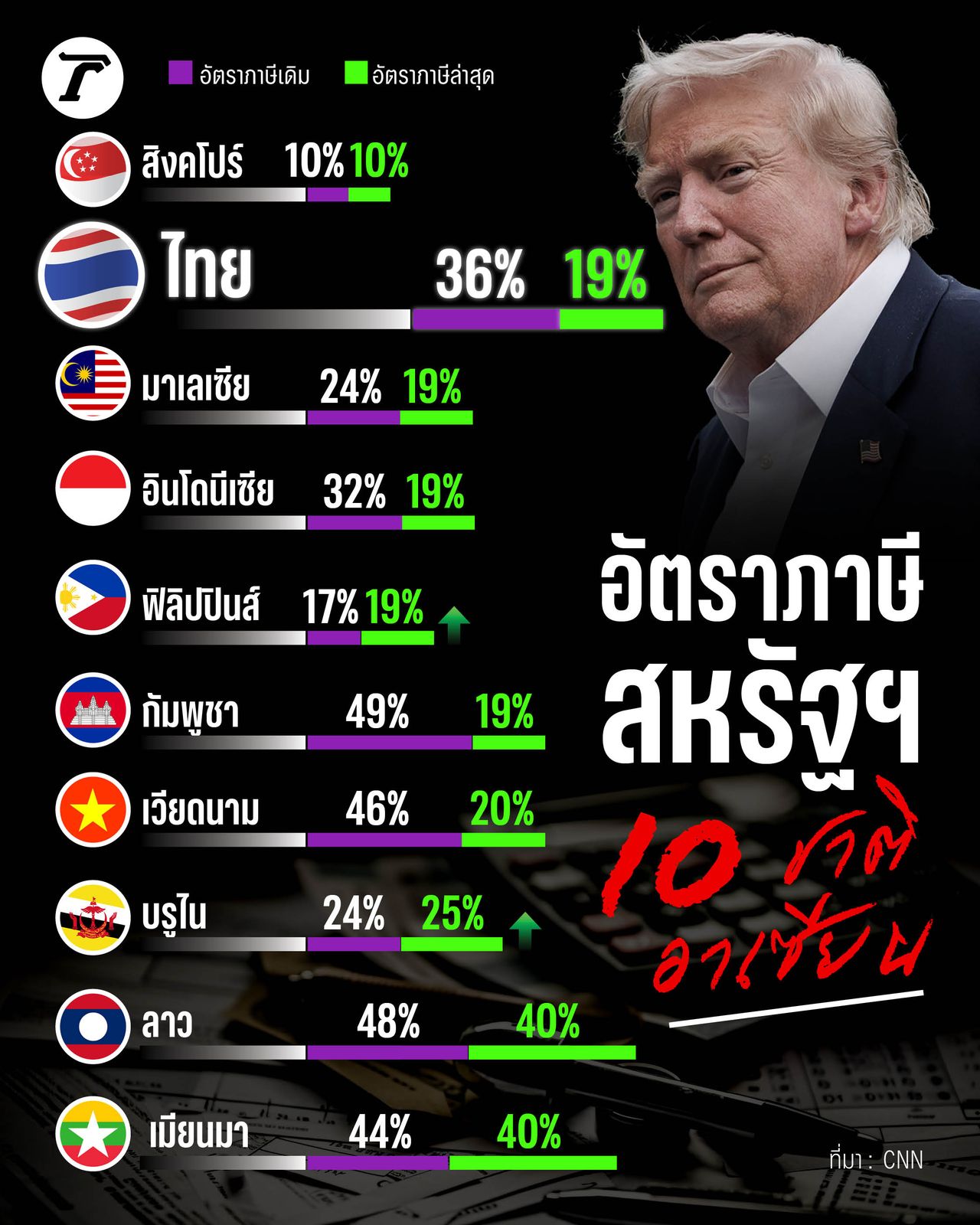 สำหรับ 10 ชาติอาเซียน ถูกเก็บภาษีต่างตอบแทนเกือบทุกประเทศยกเว้น สิงคโปร์ ที่ถูกเก็บภาษีนำเข้า 10% โดยเวียดนาม เป็นชาติแรกที่เจรจาภาษีสำเร็จ อัตราภาษีจาก 46% กลายเป็น 20%