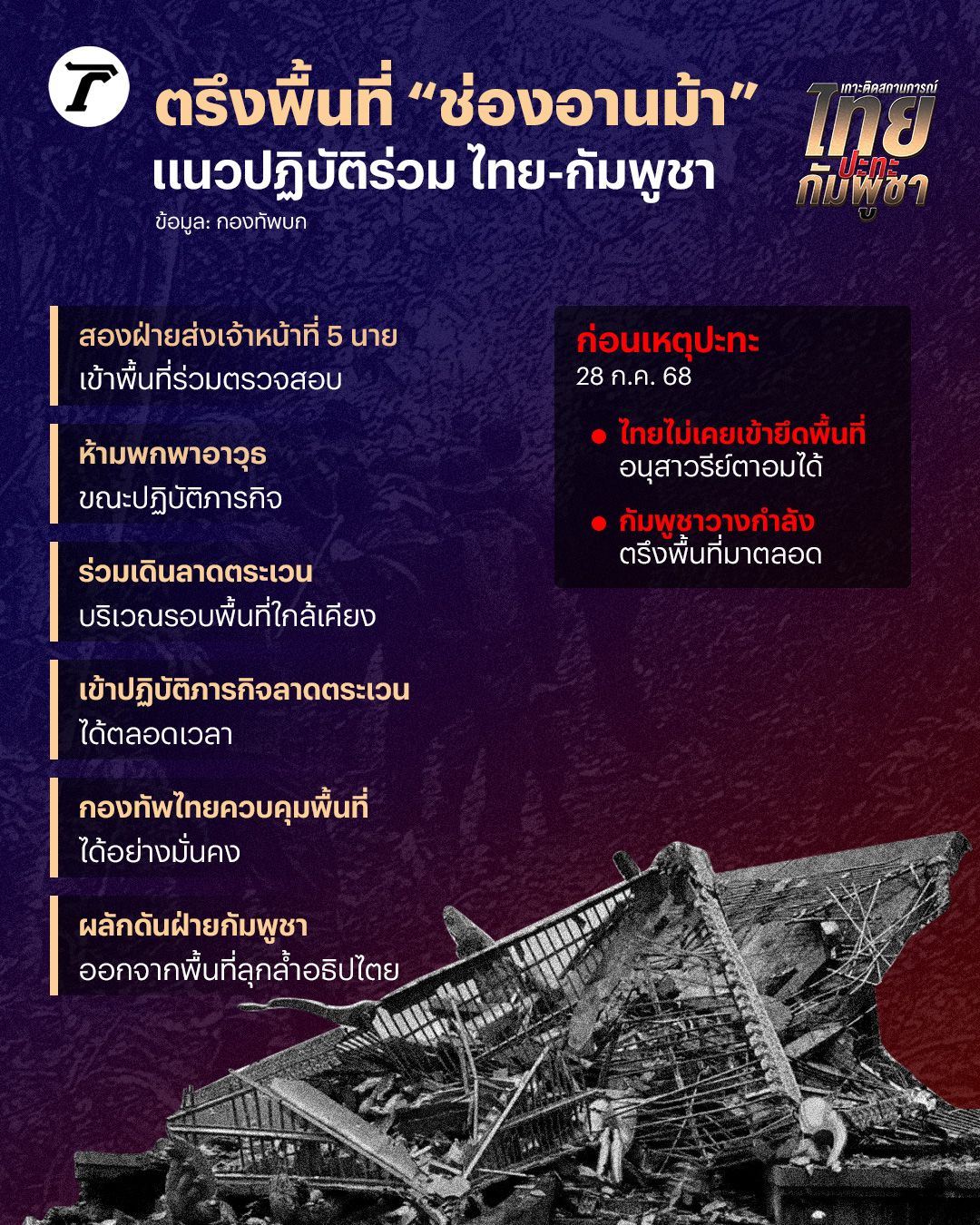 ตรึงพื้นที่ “ช่องอานม้า” จ.อุบลราชธานี แนวรบสำคัญที่ล่าสุดมีการออกมาชี้แจงถึงแนวปฏิบัติร่วม ไทย-กัมพูชา ในพื้นที่ ซึ่งเดิมกัมพูชา ลุกล้ำมาปลูกที่พัก แต่ทางไทยไม่สามารถขับไล่ออกไปได้ แม้การปะทะครั้งนี้จะเป็นการเฝ้าระวังเสริมกำลังของทั้งสองฝ่าย แต่ต้องจับตาการเจรจา GBC ถึงการดูแลพื้นที่นี้ในอนาคต