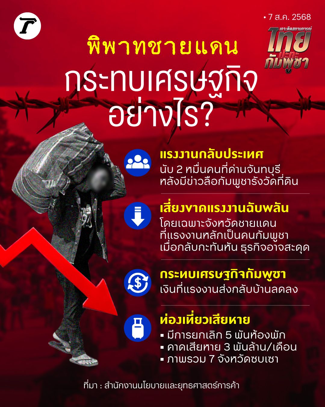 นอกจากนี้ยังส่งผลกระทบต่อเศรษฐกิจของกัมพูชาเนื่องจากเงินที่แรงงานส่งกลับบ้านลดลงอย่างมาก โดยหากสถานการณ์ยืดเยื้ออาจต้องพิจารณาใช้แรงงานจากลาวและเมียนมาเข้ามาทดแทน แต่ในระยะสั้นอาจเผชิญกับข้อจำกัดด้านปริมาณและประเภทของแรงงานที่แตกต่างกัน ทางแก้ระยะยาวจึงควรปรับเปลี่ยนโครงสร้างการผลิตไปสู่การใช้เทคโนโลยีและทุนมากขึ้น เพื่อลดการพึ่งพาแรงงานจากประเทศเพื่อนบ้าน