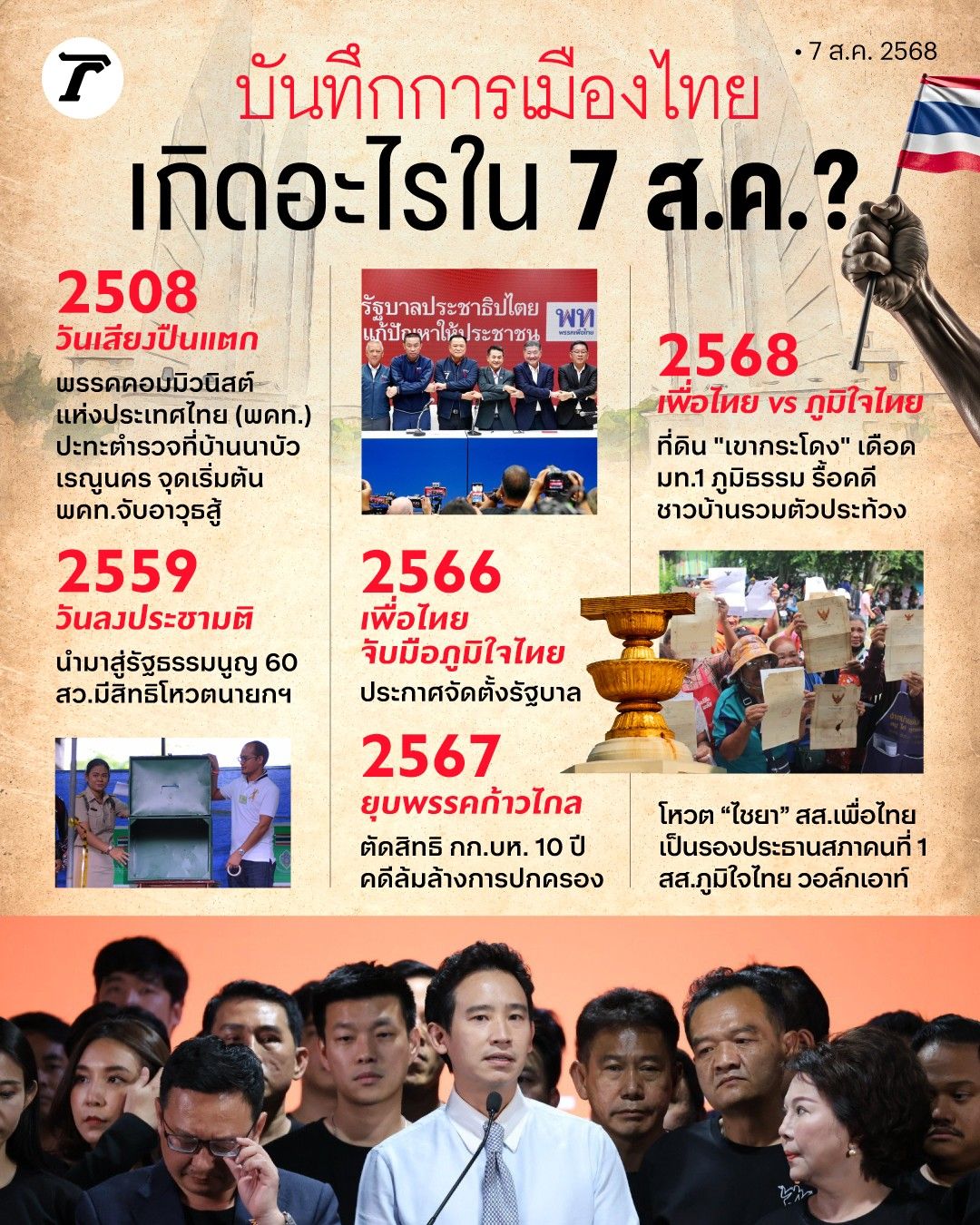 วันนี้ (7 ส.ค.2568) สถานการณ์การเมืองดุเดือดในหลายพื้นที่ ทั้งในรัฐสภาฯ ที่มีการโหวตเลือกรองประธานสภาฯ คนที่ 1 และปมที่ดินเขากระโดง ที่ชาวบ้านได้ออกมาคัดค้านการเพิกถอนโฉนดที่ดินพิพาท ซึ่งหากย้อนไปในอดีต พบว่าวันที่ 7 สิงหาคม เคยเกิดหลายเหตุการณ์สำคัญที่ส่งผลกระทบใหญ่ต่อการเมืองของไทย