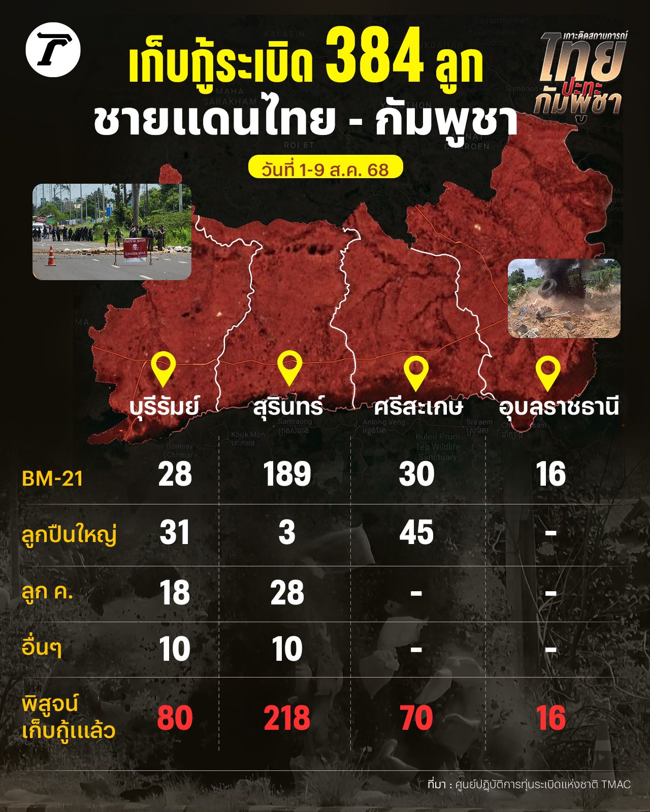 วานนี้ (10 ส.ค. 68) ศูนย์ปฏิบัติการทุ่นระเบิดแห่งชาติ (TMAC) กองบัญชาการกองทัพไทย สรุปผลการปฏิบัติงาน ภารกิจสำรวจ พิสูจน์ทราบการเก็บกู้และทำลายวัตถุระเบิดในพื้นที่ 4 จังหวัดชายแดนไทย-กัมพูชา ระหว่างวันที่ 1 - 9 ส.ค. 68 พิสูจน์และเก็บกู้แล้วรวม 384 ลูก ดังนี้