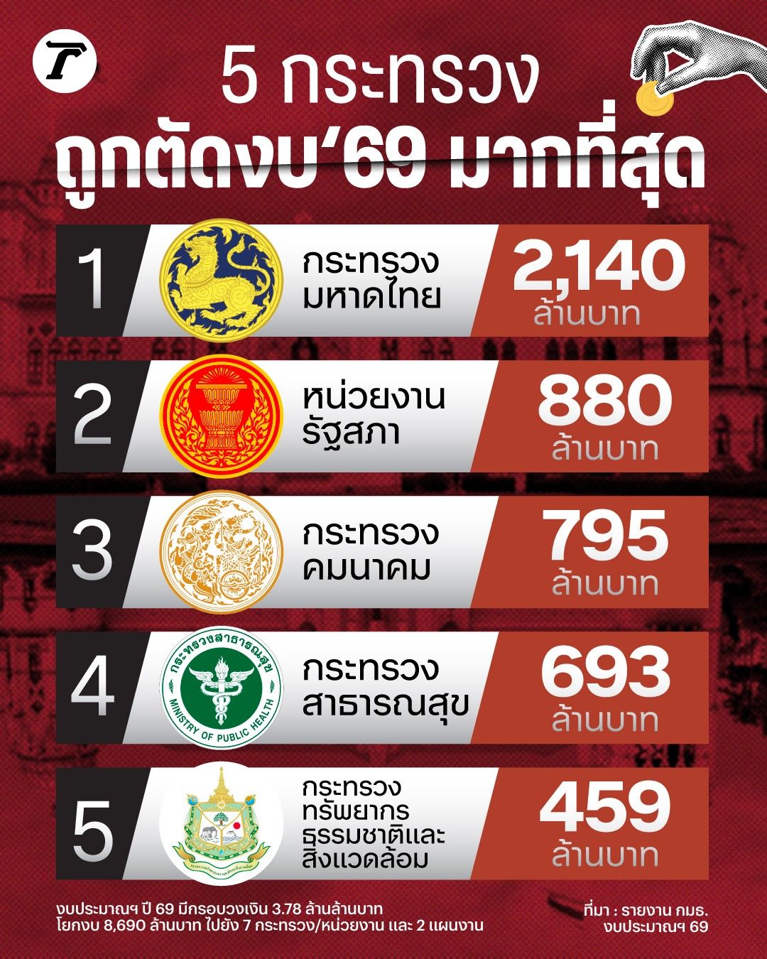 มีรายงานของ กมธ.งบประมาณฯ 2569 ปรับลดงบทั้งสิ้น 8,920 ล้านบาท สำหรับ 5 กระทรวงและหน่วยงานที่ถูกปรับลดงบมากที่สุด ได้แก่