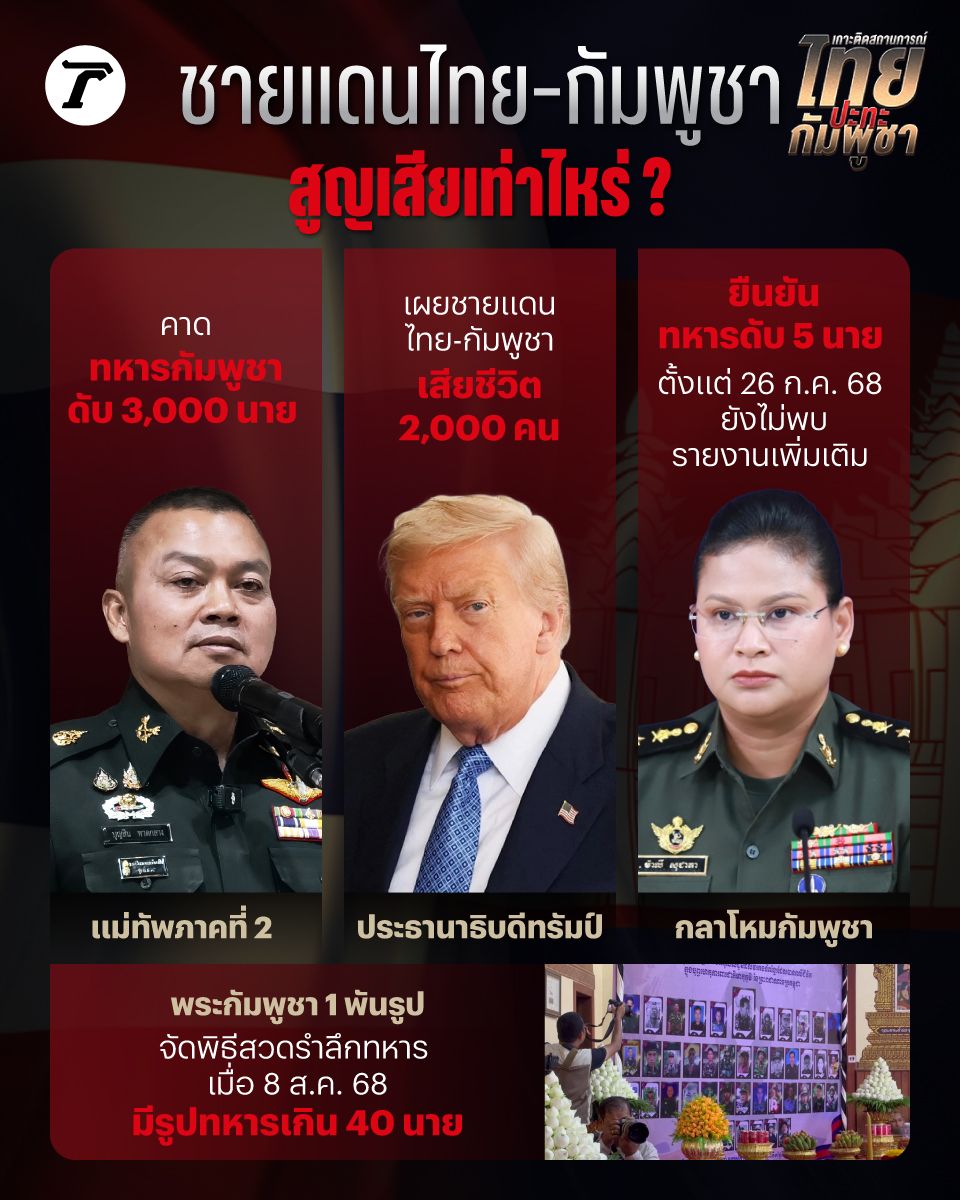 เหตุปะทะชายแดน "กัมพูชา" สูญเสียเท่าไหร่? "ทรัมป์" แถลงล่าสุดมีผู้เสียชีวิตกว่า 2,000 ราย ขณะที่แม่ทัพภาค 2 คาดเกิน 3 พันนาย ด้านกัมพูชา ยังไม่อัปเดตเพิ่มเติมจากยอด 5 นาย
