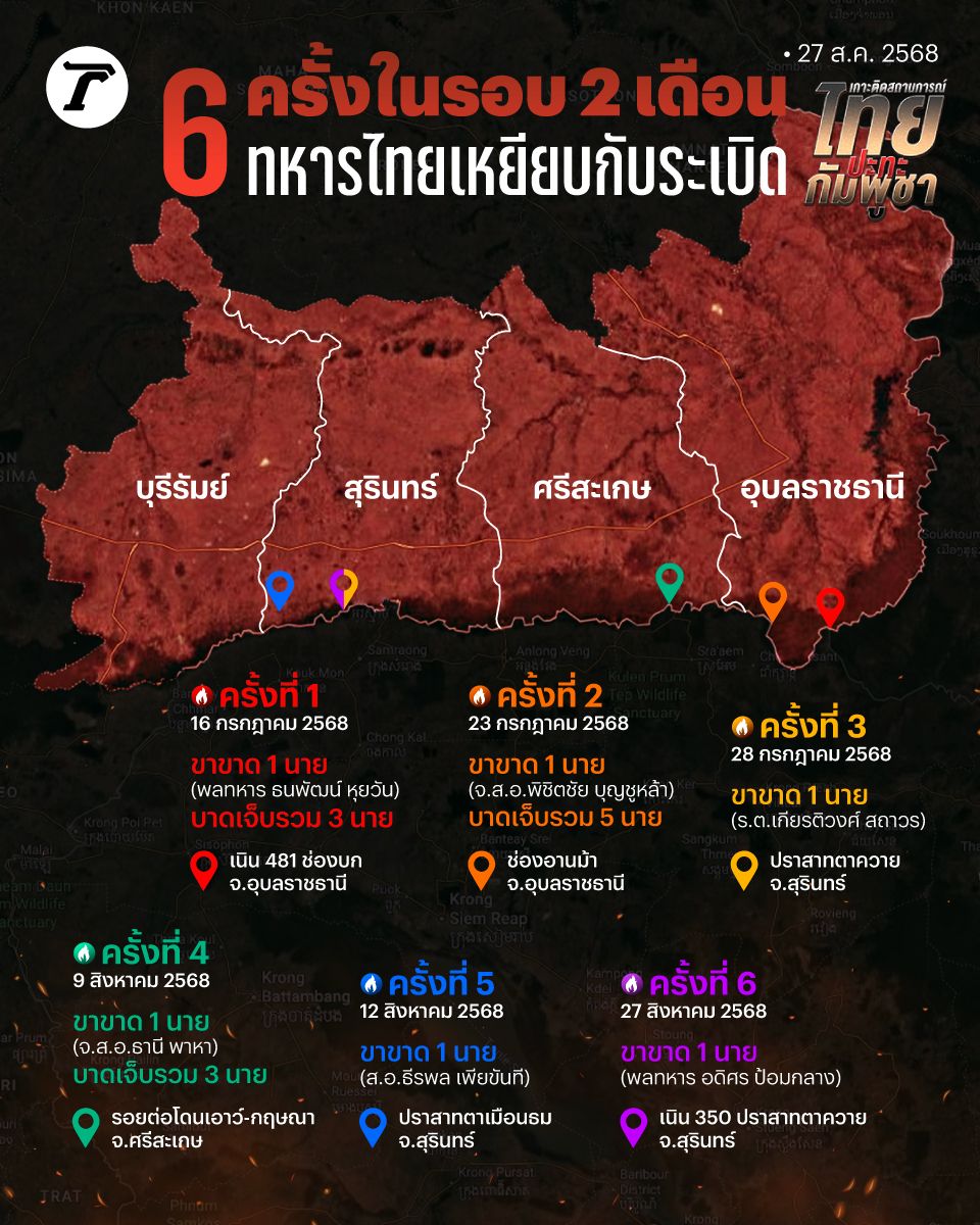 ทหารไทยเหยียบกับระเบิด ชายแดนไทย-กัมพูชา 6 ครั้งในรอบ 2 เดือน สูญเสียขา 6 นาย บาดเจ็บเพียบ ล่าสุดวันนี้ (27 สิงหาคม 2568) เวลา 15.45 น. พลทหาร อดิศร ป้อมกลาง สังกัด กองพันทหารราบที่ 1กรมทหารราบที่ 23 เหยียบกับระเบิด ขณะปฏิบัติหน้าที่ในพื้นที่ ปราสาทตาควาย เบื้องต้นได้รับบาดเจ็บ บริเวณขาขวาท่อนล่างขาด แม้บรรลุข้อตกลงหยุดยิงแล้ว แต่ทุ่นระเบิดจำนวนมากกระจายอยู่ที่รอยต่อของ 2 ประเทศ ท่ามกลางความตึงเครียดของประชาชนในพื้นที่