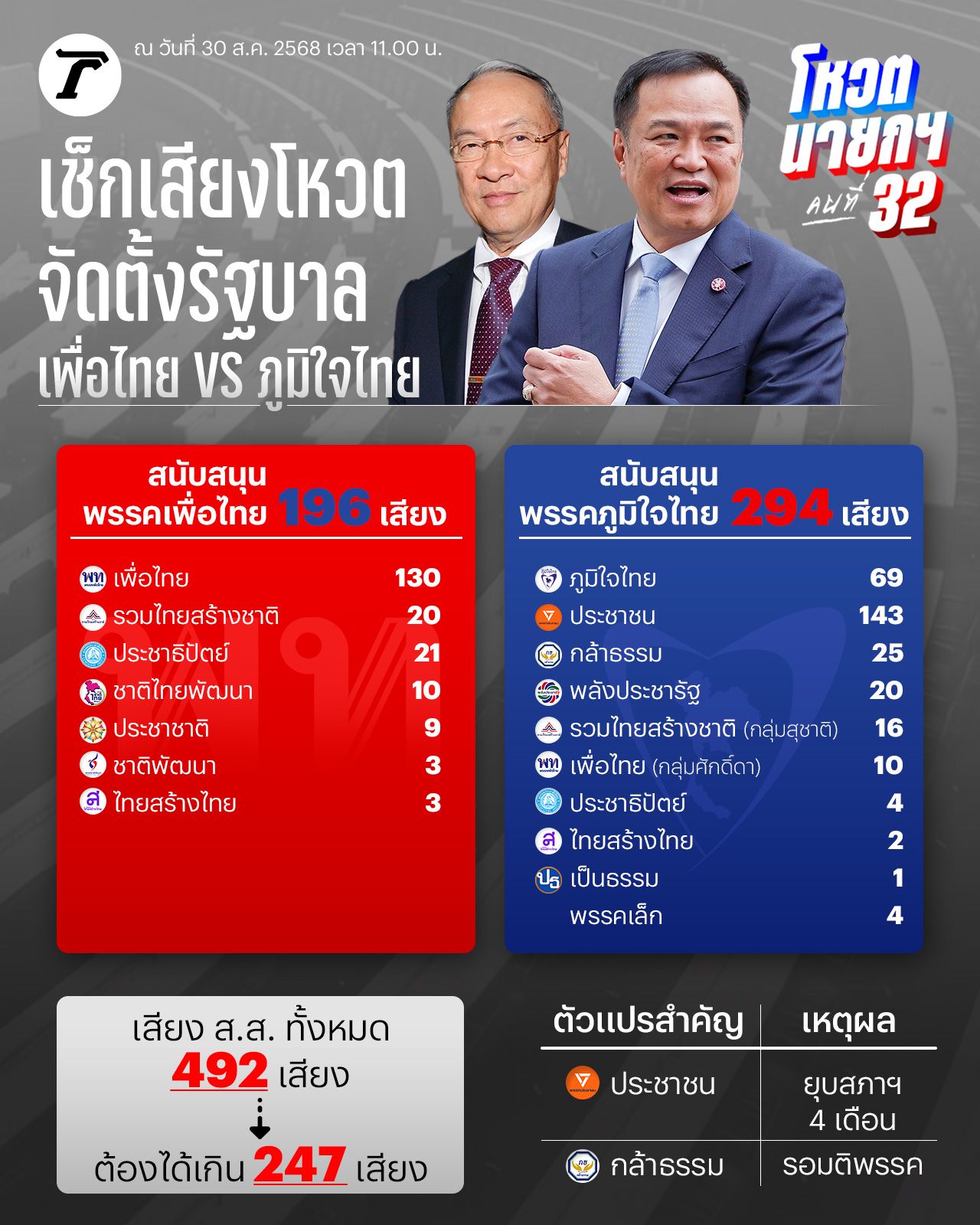 เช็กเสียงโหวตจัดตั้งรัฐบาล เพื่อไทย VS ภูมิใจไทย ในภาวะฝุ่นตลบการเมือง พรรคประชาชน เป็นจิ๊กซอว์สำคัญ ท่ามกลางเงื่อนไขการแก้รัฐธรรมนูญก่อนยุบสภาฯ ขณะที่กล้าธรรม อ้างว่ายังต้องรอมติพรรค หากลองเช็กเสียง เมื่อช่วงเช้าวันนี้ 30 ส.ค. 68 ยังมีโอกาสที่พรรคเพื่อไทย หรือพรรคภูมิใจไทย จะเป็นแกนนำจัดตั้งรัฐบาล
