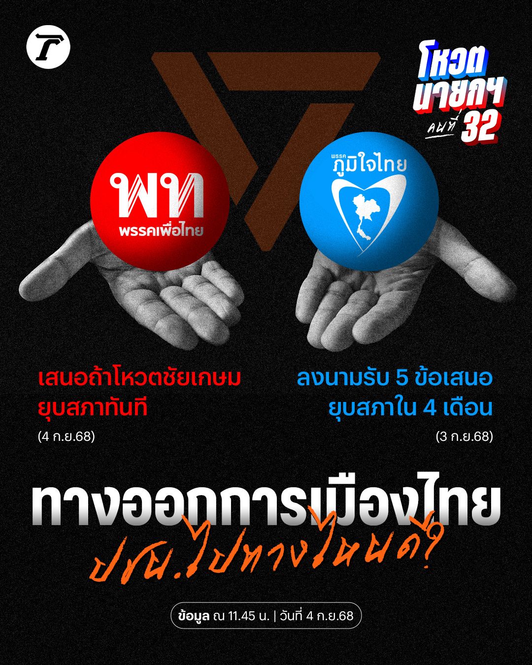 ทางออกการเมืองไทย พรรคประชาชน จะเลือกทางไหน? หลังลงนามภูมิใจไทย หนุนโหวตนายกฯ "อนุทิน" แต่ล่าสุดพรรคเพื่อไทย ยื่นดีลใหม่โหวต "ชัยเกษม" ยุบสภาทันที