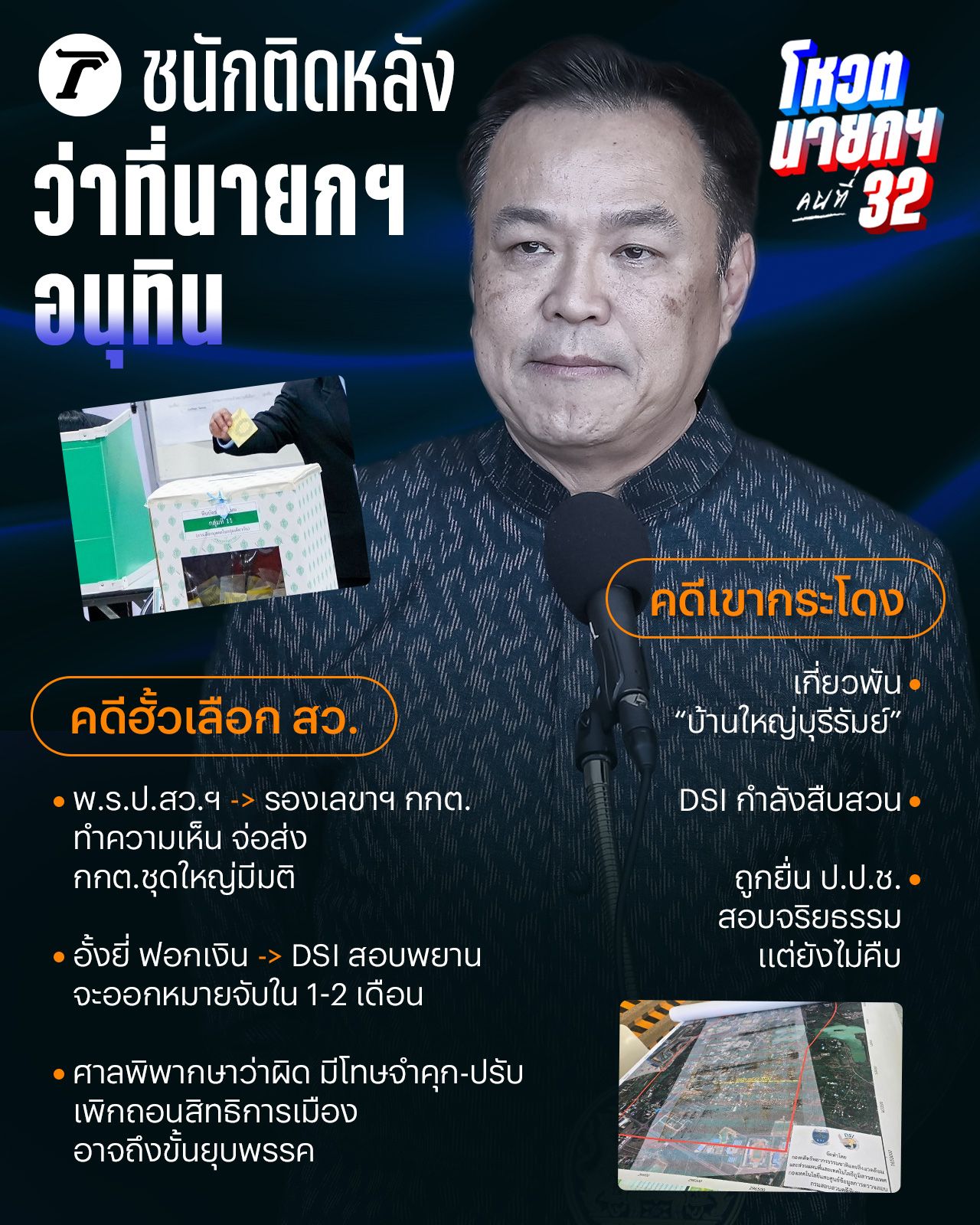 ขณะที่ตัวแปรสำคัญอย่าง พรรคประชาชน ได้ประกาศสนับสนุนนายอนุทินเป็นนายกฯ ภายใต้ 5 เงื่อนไขแก้รัฐธรรมนูญ-ยุบสภาใน 4 เดือน ท่ามกลางข้อกังวลหลายฝ่ายว่ารวมถึงพรรคเพื่อไทย ที่ออกมาโจมตีว่า การเลือกนายอนุทินขึ้นสู่ตำแหน่งนายกฯ จะทำให้คดีสำคัญอย่าง "คดีฮั้วเลือก สว." และ "คดีที่ดินเขากระโดง" ถูกล้าง
