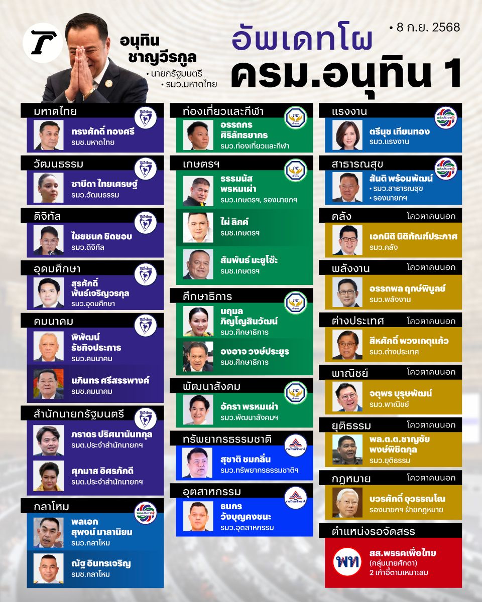 โยกนายอรรถกร ศิริลัทธยากร นายทะเบียนพรรค ไปเป็น รมว.การท่องเที่ยวและกีฬา ส่วนนางนฤมล ภิญโญสินวัฒน์ หัวหน้าพรรคกล้าธรรมจะมาเป็นรมว.ศึกษาธิการ