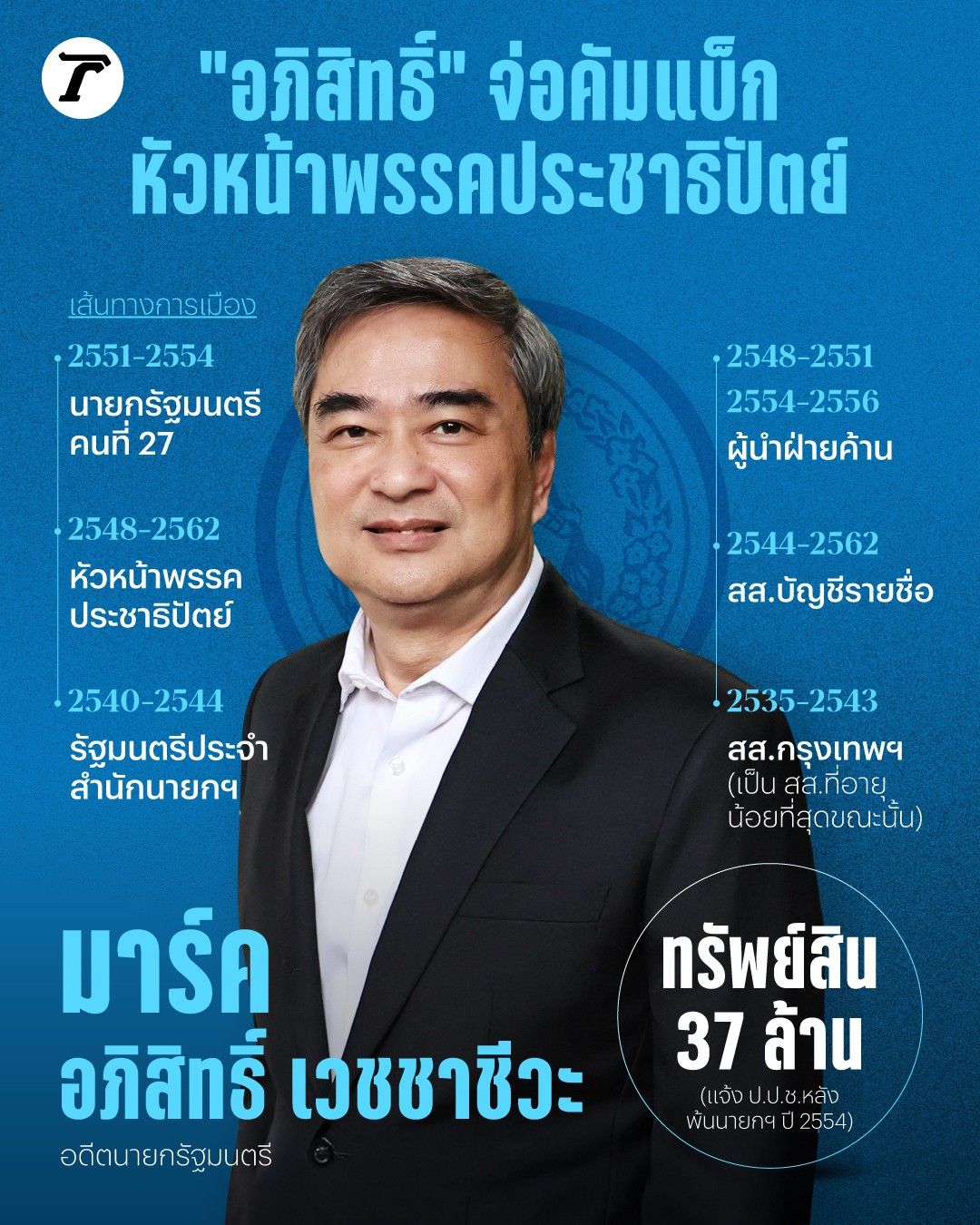 นายอภิสิทธิ์ ในวัย 62 ปี เคยผ่านประสบการณ์การเมืองมาแล้วในทุกระดับ ตั้งแต่ สส.แบ่งเขต ในพื้นที่กรุงเทพมหานคร ที่อายุน้อยที่สุด ก้าวขึ้นมาเป็น สส.บัญชีรายชื่อหลายสมัย จนกระทั่งเป็นหัวหน้าพรรคหนุ่มครั้งแรกตอนปี 2548 เป็นทั้งผู้นำฝ่ายค้าน จนกระทั่งพลิกขั้วมาเป็นรัฐบาลและนั่งแท่นนายกรัฐมนตรคนที่ 27 เมื่อปี 2551 จนชื่อของเขายังติดหูคนไทยอยู่มาจนถึงปัจจุบันนี้