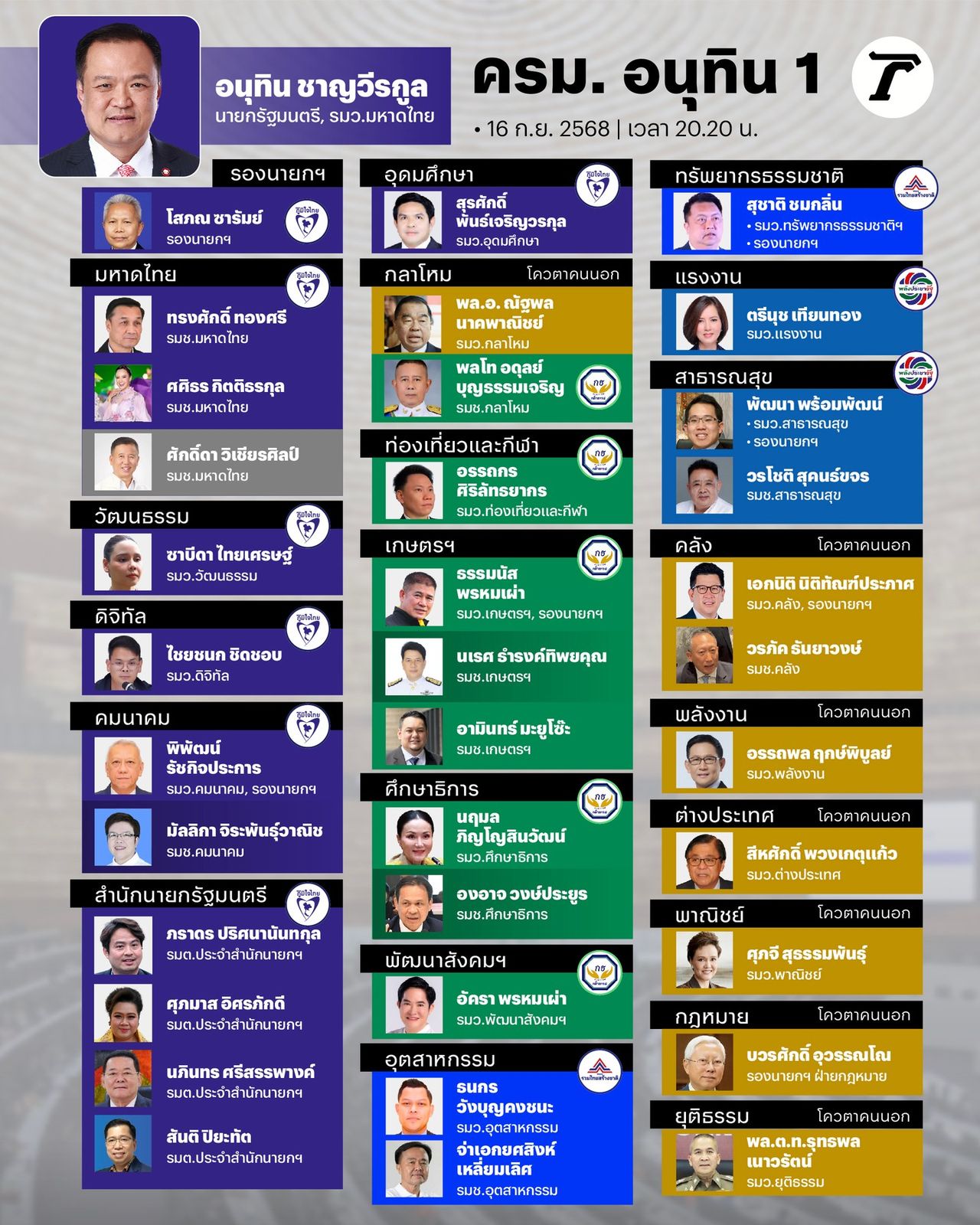 วันที่ 16 กันยายน 2568 ผู้สื่อข่าวรายงานว่า นายอนุทิน ชาญวีรกูล นายกรัฐมนตรีได้เซ็นส่งรายชื่อคณะรัฐมนตรี (ครม.) ซึ่งคาดว่าสำนักเลขาธิการคณะรัฐมนตรีจะขึ้นทูลเกล้าฯ 36 รายชื่อ ดังนี้