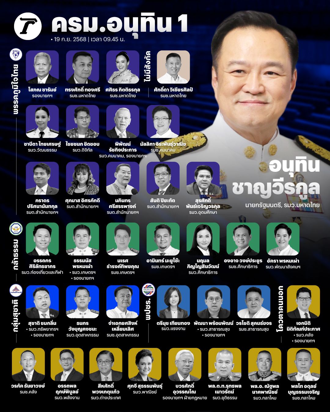 โปรดเกล้าฯ ครม. ครม.อนุทิน 1 เผยโฉมหน้า รมต.-รมว.เดินหน้านโยบายเร่งด่วน เดินหน้านโยบายเร่งด่วน จับตาทีมเศรษฐกิจคนนอก แก้ปัญหาชายแดนกัมพูชา "กล้าธรรม” เหนียวแน่นยึดเกษตร