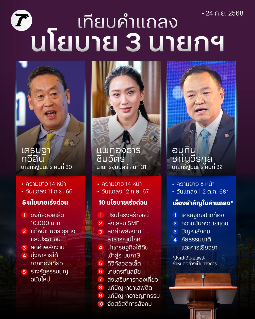 ส่องคำแถลง 3 นายกฯ ในรอบ 3 ปี จากเศรษฐา แพทองธาร สู่ “อนุทิน” การเมืองไทยหลังการเลือกตั้งครั้งล่าสุดเมื่อปี 2566 เปลี่ยนนายกฯ ถึง 3 คน โดยจุดเริ่มต้นของรัฐบาล คือ การแถลงนโยบายต่อรัฐสภา ที่คำแถลงของนายกฯ แต่ละคนมีรายละเอียดนโยบายเร่งด่วน คำมั่นสัญญา และความยาวต่างกันออกไป