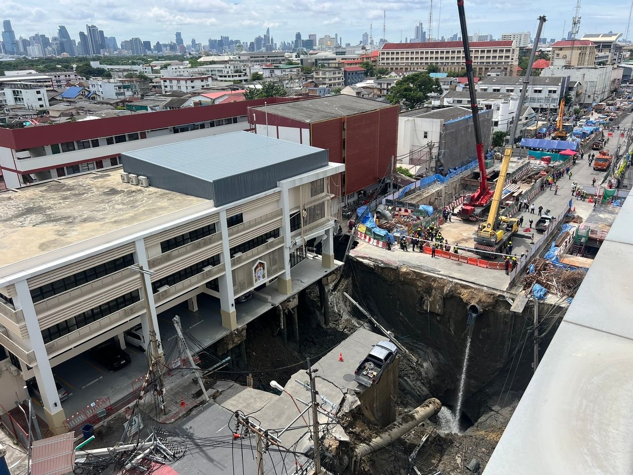 นายชัชชาติ สิทธิพันธุ์ ผู้ว่าราชการกรุงเทพมหานคร ลงพื้นที่ตรวจสอบ คาดสาเหตุเกิดจากดินไหลเข้าไปในอุโมงค์ก่อสร้างรถไฟฟ้า รอยต่อระหว่างอุโมงค์และสถานี ซึ่งมีจำนวนมาก เมื่อรอยต่อเกิดความเสียหาย ดินด้านบนจึงไหลเข้าไปสู่ตัวอุโมงค์ และช่องว่างใต้ดินที่กำลังก่อสร้าง จึงทำให้สิ่งก่อสร้างใกล้เคียงบริเวณดังกล่าวทรุดตัวลงไปด้วย