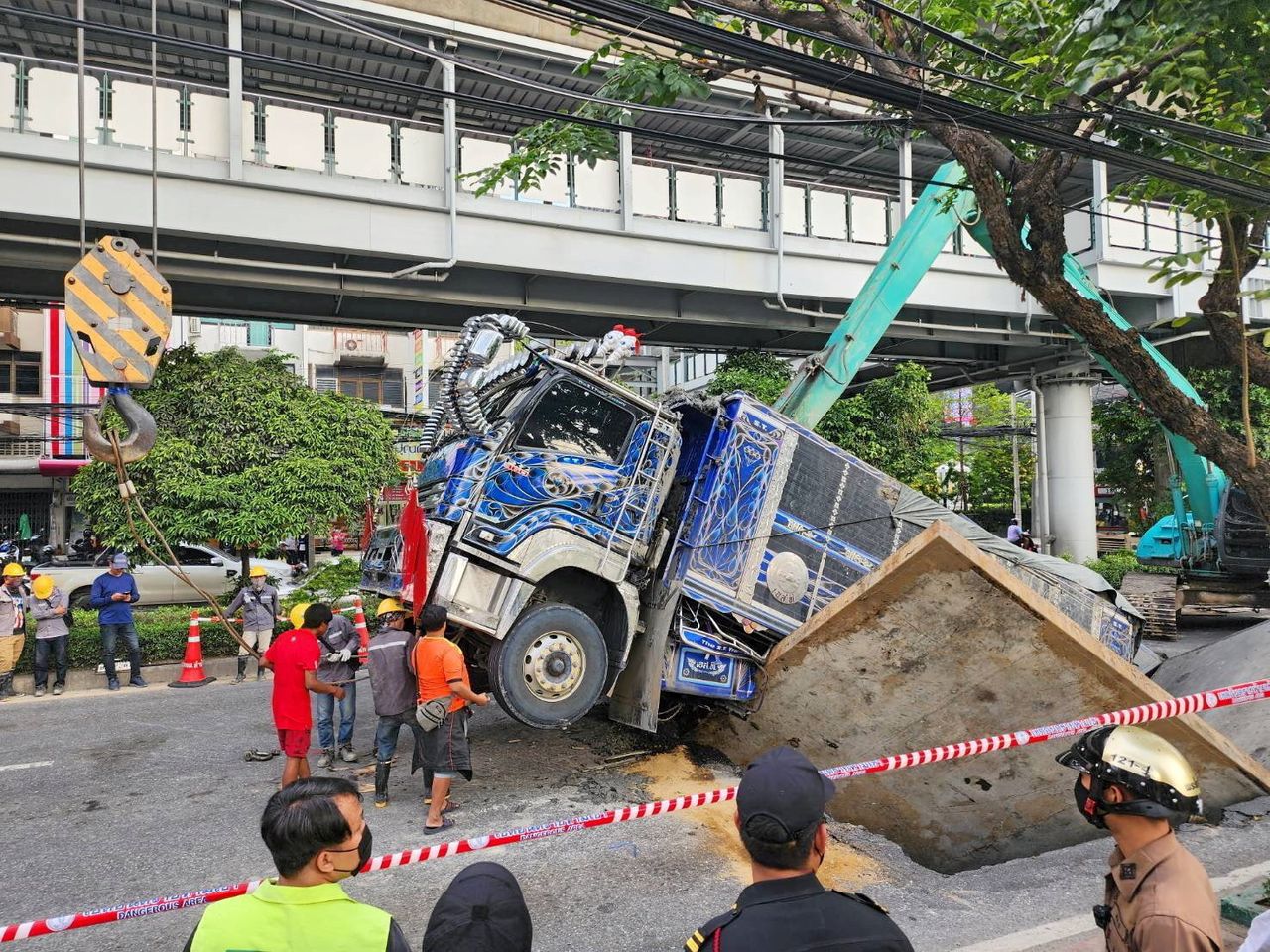 รถบรรทุกตกลงบ่อพักวางสายไฟฟ้าลงดินของการไฟฟ้า ขนาดกว้าง 7 เมตร ลึก 15 เมตร บาดเจ็บ 2 คน รถบรรทุก รถแท็กซี่ และรถจักรยานยนต์เสียหาย ผู้ว่าชัชชาติ สิทธิพันธุ์ ผู้ว่าราชการกรุงเทพมหานคร ลงพื้นที่ตรวจสอบคาดสาเหตุคือ รถบรรทุกดินน้ำหนักเกินกำหนดทำให้แผ่นคอนกรีตปิดฝาบ่อร้อยสายไฟรับน้ำหนักไม่ไหว และคานเหล็กด้านล่างแผ่นคอนกรีต 4 เส้นบนถนนไม่ได้มาตรฐาน