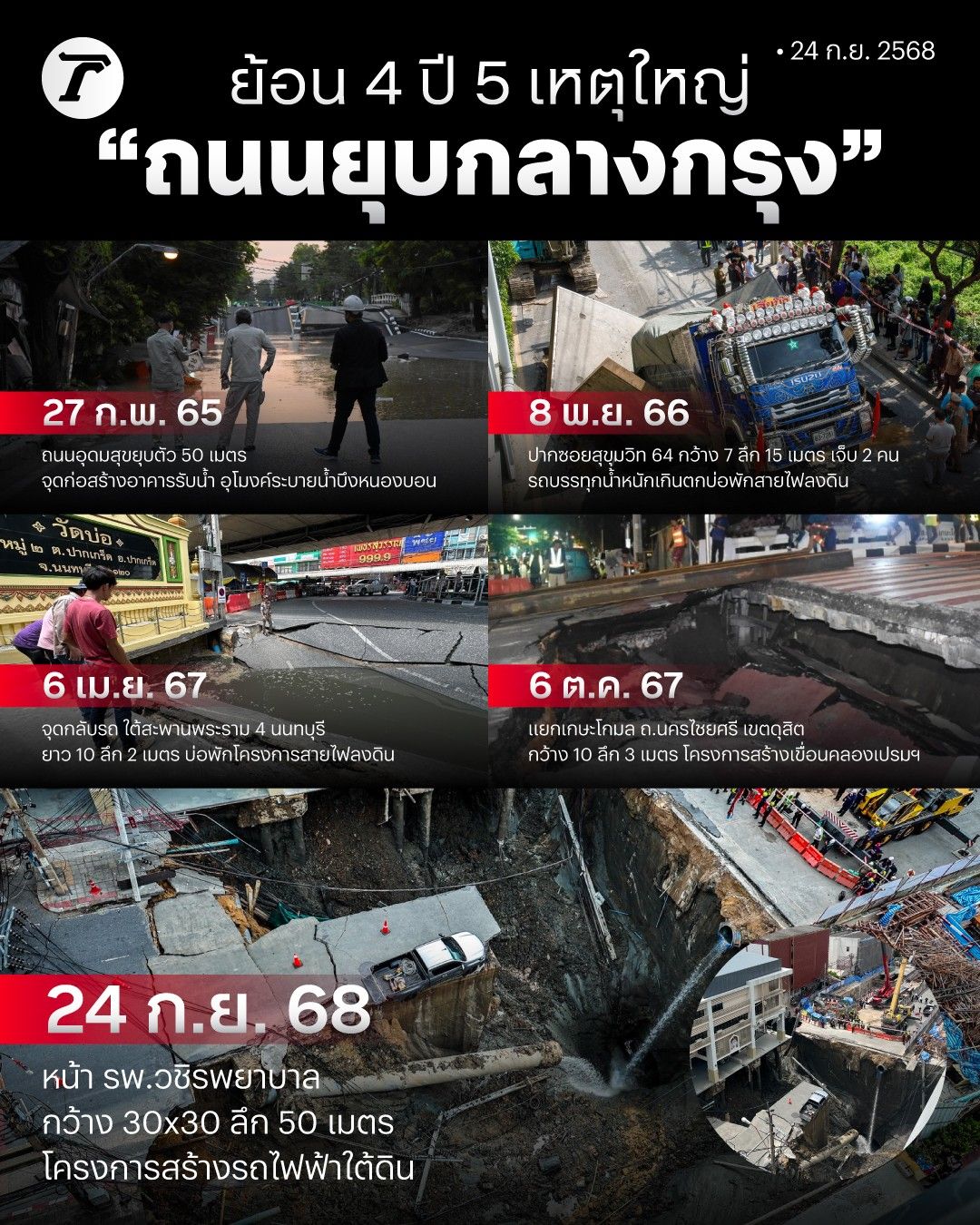ย้อนไทม์ไลน์ 4 ปี 5 เหตุการณ์ "ถนนยุบ" ครั้งใหญ่กลางกรุง ก่อนถึงครั้งล่าสุดที่หน้าวชิรพยาบาล สะท้อนปัญหาโครงสร้างพื้นฐานไทย กระทบความปลอดภัยของประชาชน