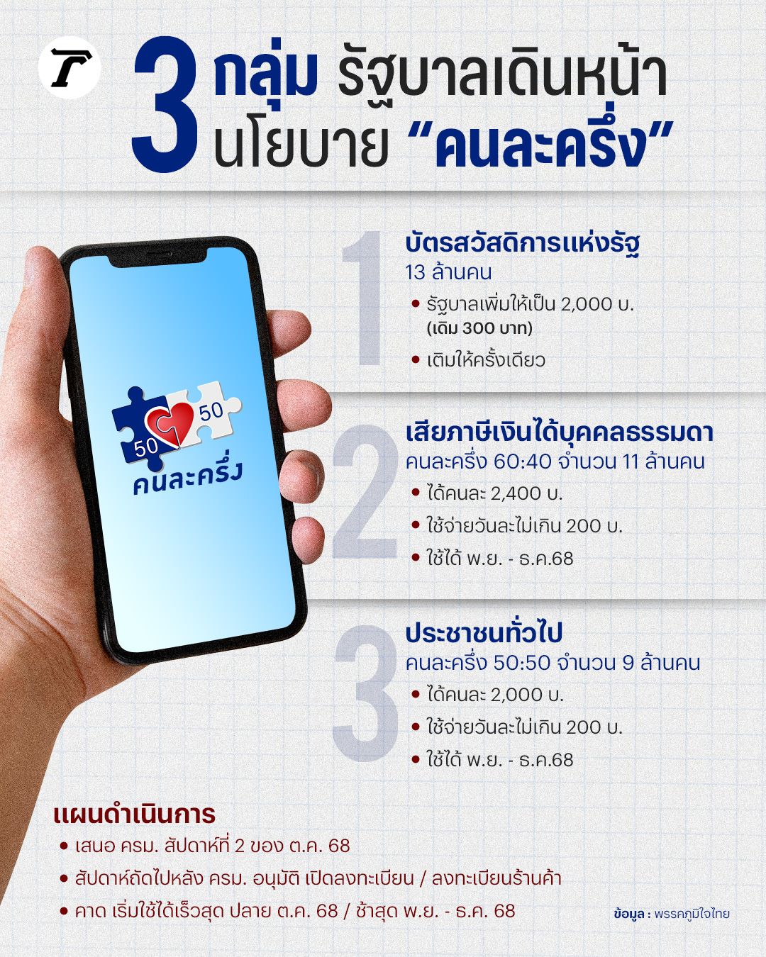 รัฐบาลเดินหน้านโยบาย "คนละครึ่ง" 3 กลุ่ม เปิดลงทะเบียน สัปดาห์ถัดไปหลัง ครม. อนุมัติ คาดเริ่มใช้ได้ช้าสุด พ.ย. - ธ.ค. 68