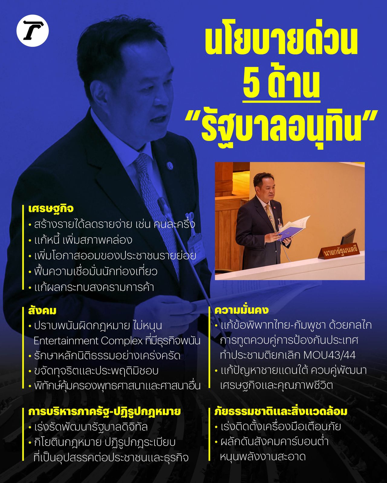 นายกฯ อนุทิน แถลงนโยบายเร่งด่วน 5 ด้าน เศรษฐกิจ ความมั่นคง สังคม ภัยธรรมชาติและกฎหมาย เดินหน้าโครงการคนละครึ่ง แก้ข้อพิพาทไทย-กัมพูชา จัดทำประชามติยกเลิก MOU 43/44