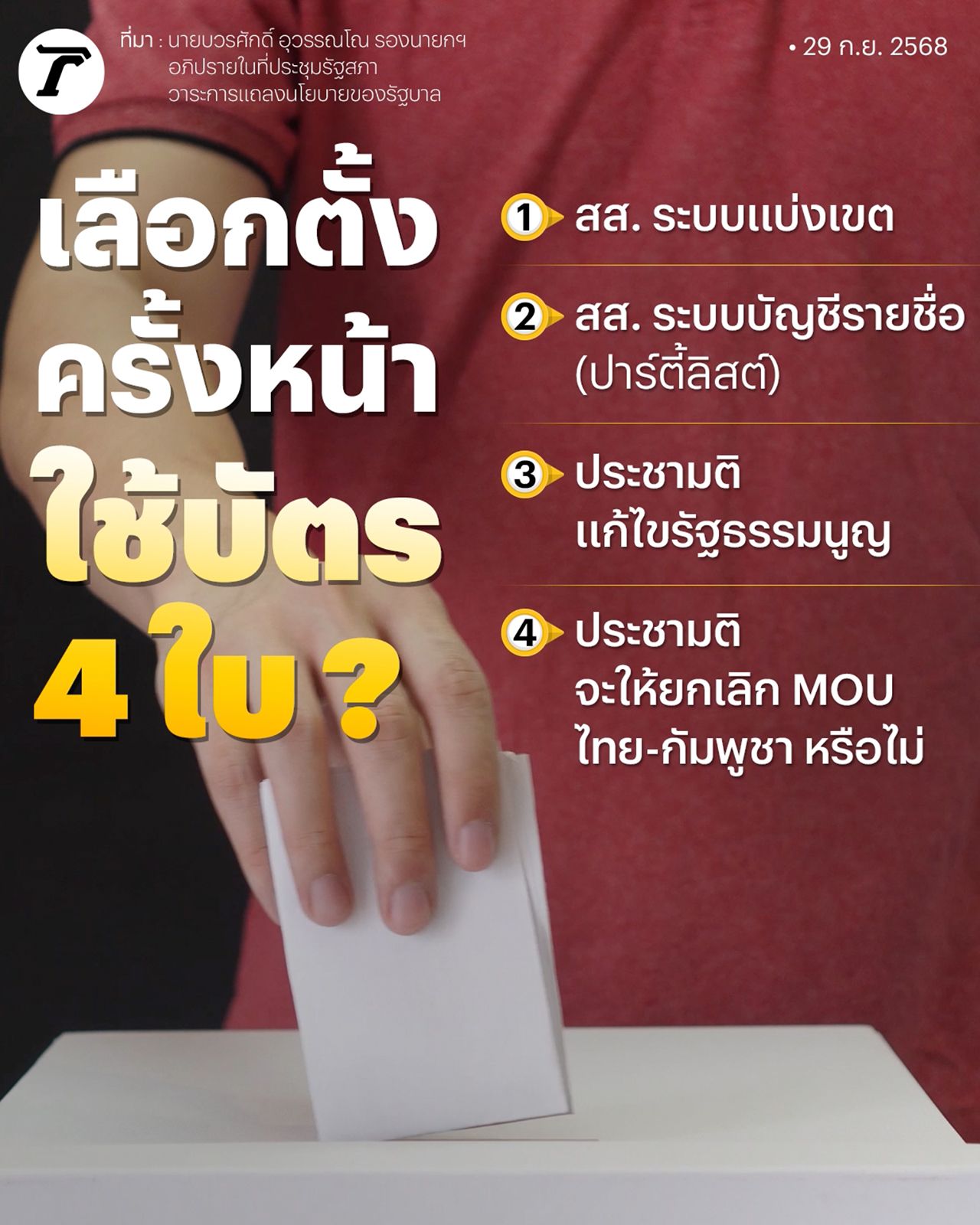 เลือกตั้งครั้งหน้า ใช้บัตร 4 ใบ เลือก สส. แก้รัฐธรรมนูญ-MOU ไทย กัมพูชา ประชาชนพร้อมไหม ? อ.บวรศักดิ์ ชี้ เลือกพร้อมกันเพื่อประหยัดงบประมาณ และเป็นมติของประชาชนแท้จริง