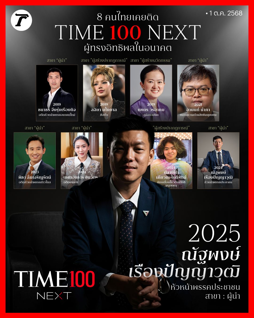 Time นิตยสารชื่อดังจากสหรัฐอเมริกา เริ่มจัดทำรายชื่อ TIME 100 Next ตั้งแต่ปี 2019 ยกย่องคนรุ่นใหม่ทั่วทุกมุมโลกที่มีอิทธิพลในสังคม นำไปสู่ความเปลี่ยนแปลงในอนาคต ล่าสุด “เท้ง” ณัฐพงษ์ เรืองปัญญาวุฒิ เป็นคนที่ 8 และคนไทยคนเดียวที่ได้รับเกียรติในปี 2025 แล้วก่อนหน้านี้มีใครบ้าง ?