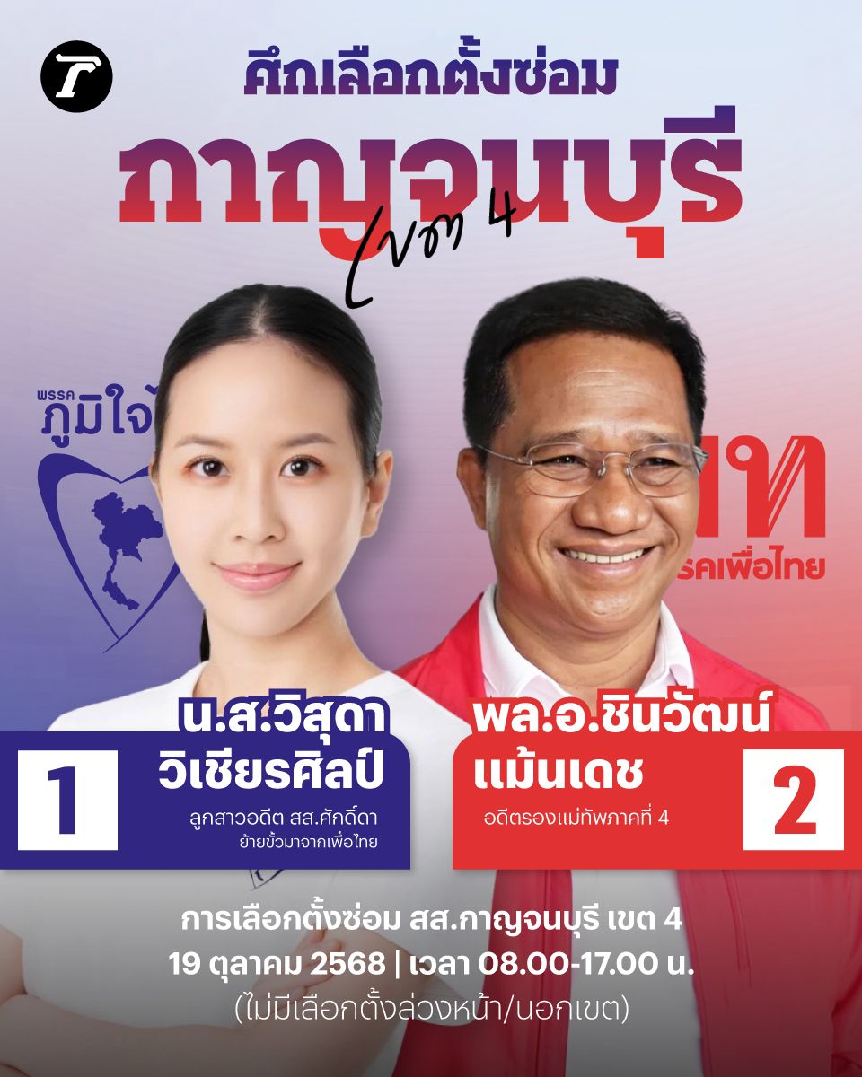 สนามเลือกตั้งซ่อมสมาชิกสภาผู้แทนราษฎร (สส.) จังหวัดกาญจนบุรี เขต 4 ที่จะมีขึ้นในวันอาทิตย์ที่ 19 ตุลาคม 2568 นี้ กำลังเป็นที่จับตามองอย่างยิ่ง เป็นการต่อสู้กันโดยตรงระหว่าง 2 พรรคการเมืองใหญ่อย่าง พรรคภูมิใจไทย แกนนำรัฐบาลเฉพาะกิจ และพรรคเพื่อไทย สนามที่ 2 หลังเป็นฝ่ายค้าน ทั้งคู่มีเดิมพันที่สูงในสนามเลือกตั้งครั้งนี้